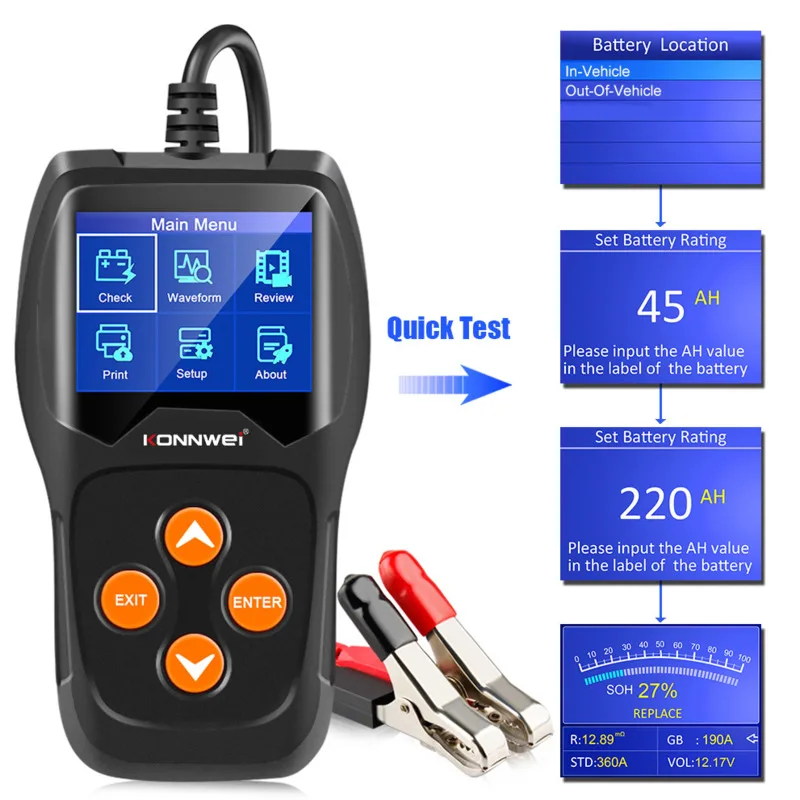 Описание товара:KONNWEI KW600-это новый аккумулятор-тестер, обновленный от старого классического тестера с подсветкой на рынке, направленный на быструю и точную проверку здоровья батареи, а также на проверку рабочего состояния генератора. Это профессиональный диагностический инструмент транспортного средства для проверки проблем с системой батареи с помощью инструмента мониторинга напряжения с графическим изображением, с цветным экраном и уникальным дизайном узора, бесплатным обновлением в течение всего срока службы, KONNWEI KW600-идеальный инструмент для тестирования батареи для вашей работы и семьи.Особенности:Быстрая и Плавная скорость работы с чипом STM32.Определение состояния батареи или замена.Проверьте емкость батареи-холодное сгибание ампер (CCA), DIN, EN и IEC информация относительно номинальной мощности батареи.Проверьте значение внутреннего сопротивления (м).Отображение срока службы в процентном соотношении (%) .Тест на проворот коленвала батареи, тест на нагрузку, тест на зарядку аккумулятора, тест на пульсацию.Мониторинг напряжения в реальном времени.Хранение и обзор результатов тестирования.Результаты тестирования печати и отчет о батарее на ПК.Обновление срока службы бесплатно.Поддержка языков:Английский, японский, французский, немецкий, русский, голландский, испанский, португальский, польский, итальянский.Применение:Используйте для тестирования широкого диапазона батарей 12 В (начиная {SLI}, глубокий циклон и морской) влажных (затопленных),VRLA или без обслуживания (MF), герметичный без технического обслуживания (SMF), абсорбирующий стеклянный коврик (AGM),EFB и гелевая клетка.Поддерживаются основные стандарты аккумуляторов CA,CCA,BCL,MCA,JIS,SAE,EN,GB,DIN и IEC.Стандарт измерения:CCA:100-2000.BCI:100-2000.CA:100-2000.MCA:100-2000.JIS:26A17-24SH52.DIN:100-1400.IEC:100-1400.EN:100-2000.SAE:100-2000.ГБ: 100-1400.Спецификация:Дисплей: цветной TFT ЖК-экран.Напряжение системы: 12 вольт.Вход Напряжение диапазон: 8V-16V.Мощность Req uirements: не требуется никаких внутренних батарей.Включение при подключении во время тестирования.Рабочая температура: 0 ℃-50 ℃.Температура хранения:-20 ℃-70 ℃.Посылка включает в себя:1 х KW600 батарея тестер блок1 х USB кабель для обновления и печати1 x коробка1 x Руководство пользователя