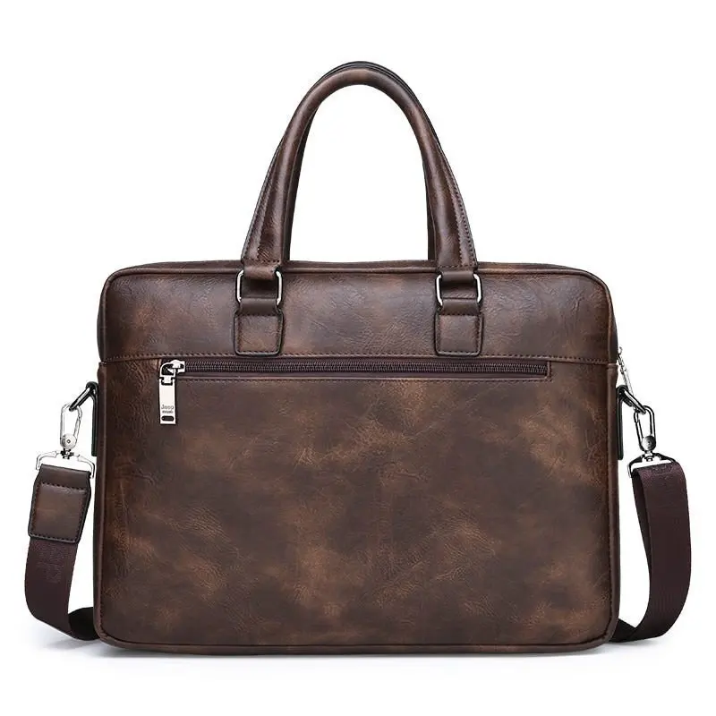 Изготовлен из сплит-кожи (высококачественная искусственная кожа). Подкладка из плотного полиэстера. Магнитная застежка-клапан на лицевой стороне. Классические кожаные ручки для переноски и наплечный брезентовый ремень. Объемное основное отделение, в которое легко помещаются пухлые папки с документами и ноутбук с диагональю 15 дюймов. Отдельно предусмотрено отделение для большого планшета или ноутбука с диагональю 13,3 дюйма. Есть отделения для телефона и мелочей. Выпускается в цветах: черный, темно-коричневый, светло-коричневый. Размер 39*6*28 см.