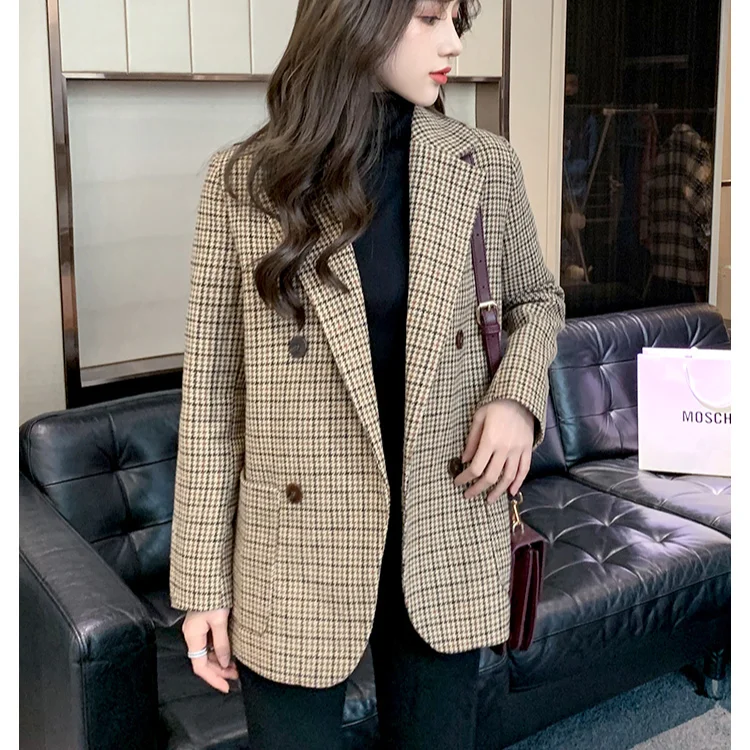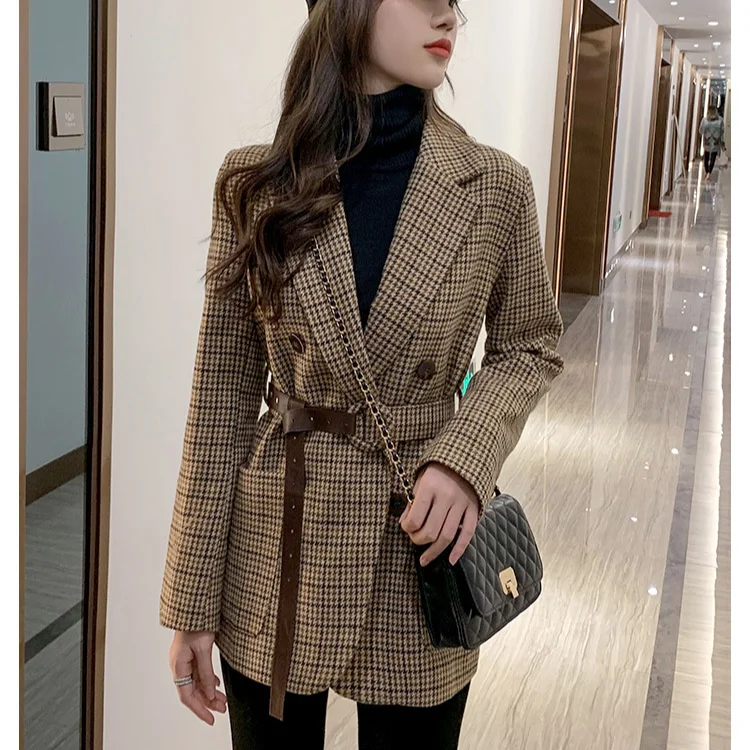 Женский винтажный блейзер из твида с поясом, двубортный клетчатый пиджак с длинным рукавом и карманами, Блейзер, костюм, 2021