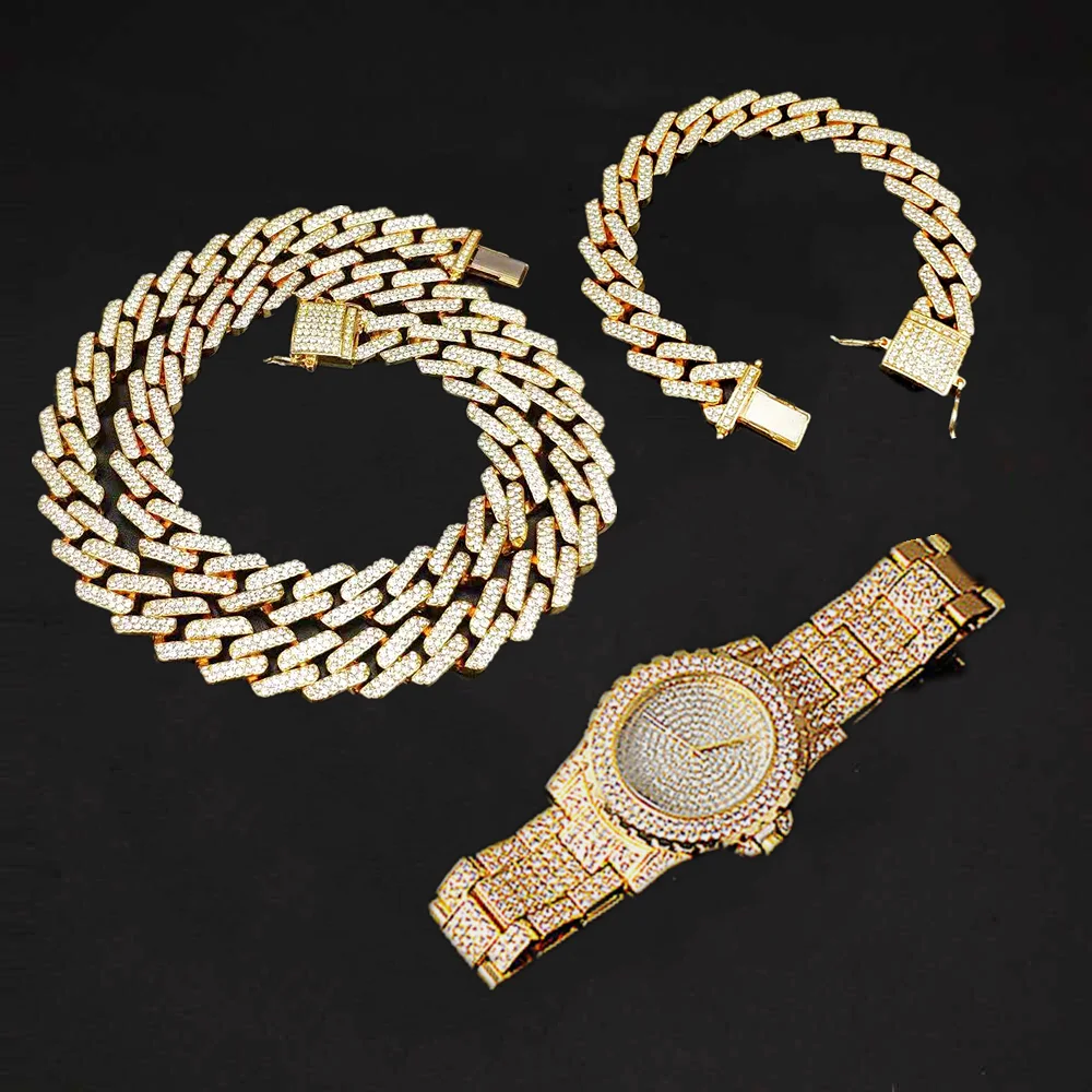 Ожерелье часы браслет украшение Майами циркониевые кубинские звенья цепочка закрепка Стразы ювелирные изделия для мужчин женщин комплект ожерелья