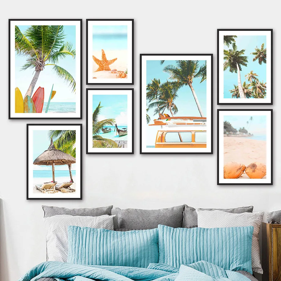 Настенная картина в виде розового автобуса, пляжа, пальмы, доски дл...