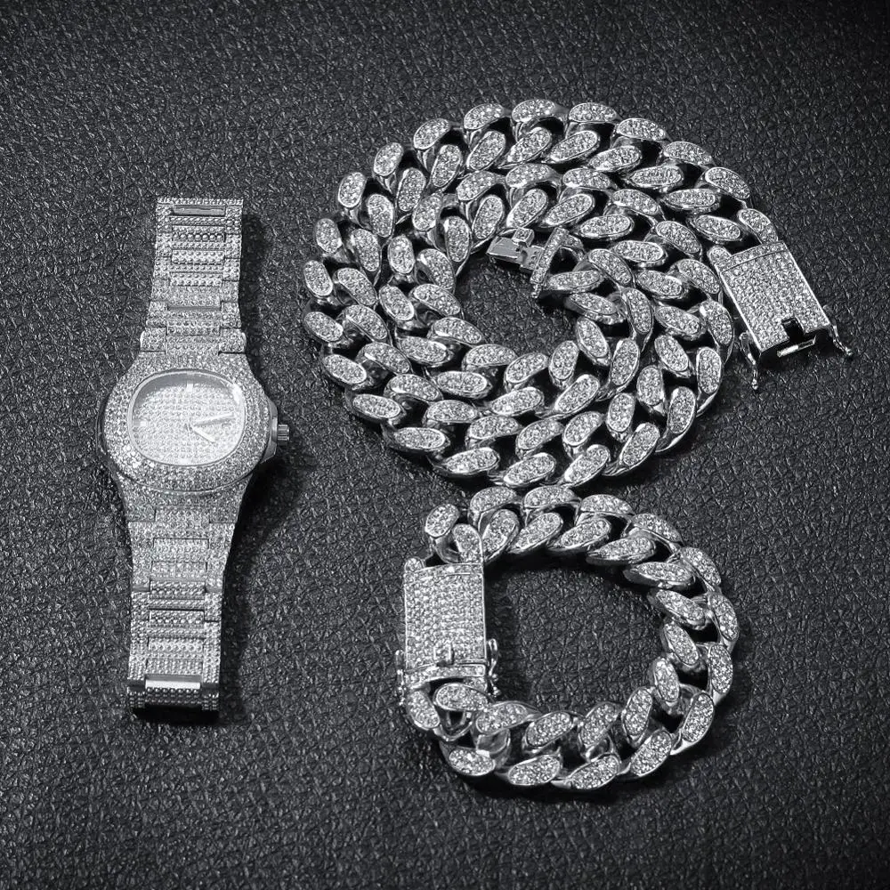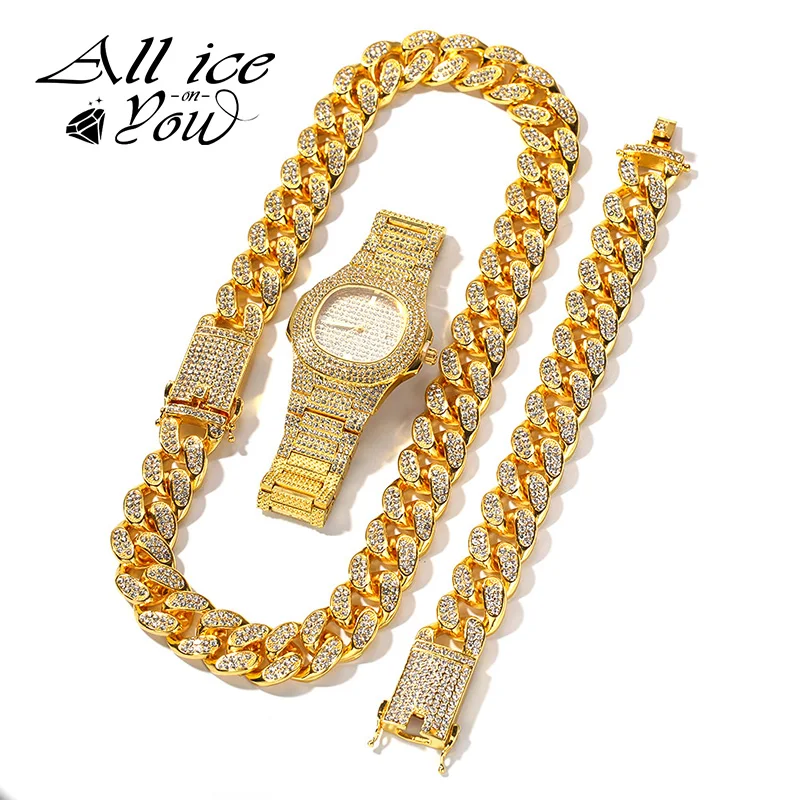Цепочка ALLICEONYOU мужская из кубинской панцирной цепи Майами, ожерелье + часы + браслет из нержавеющей стали в стиле хип-хоп, украшение для мужчин