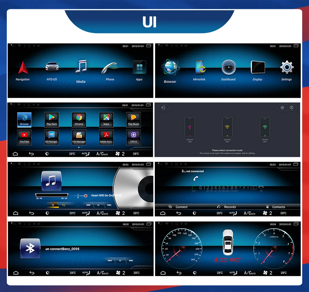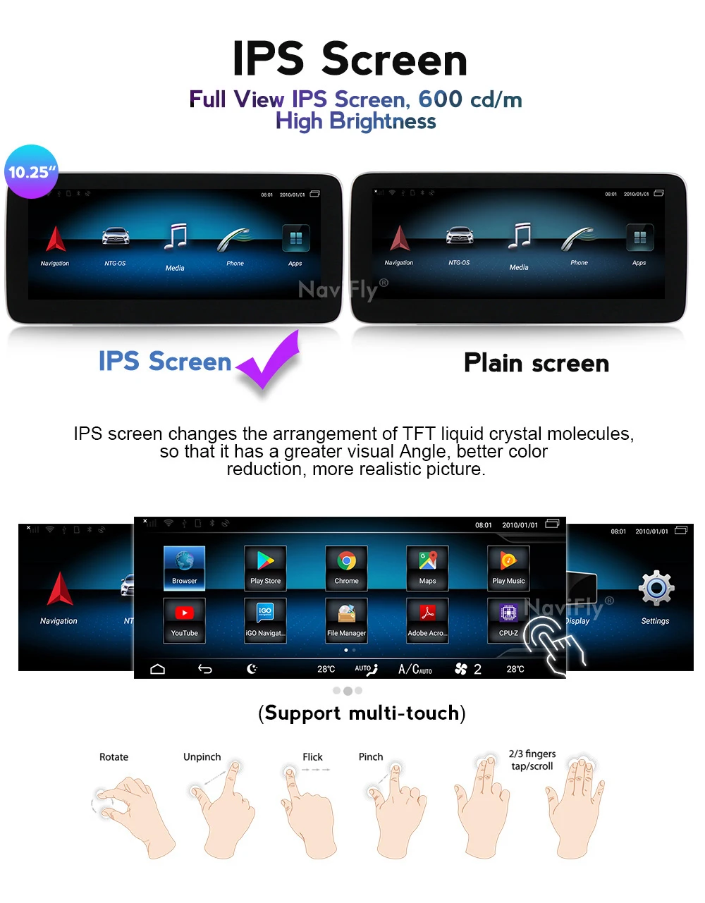 Двойное преобразование системы, оригинальная система Mercedes Benz NTG и система Android. Поддержка всех оригинальных функций NTG, таких как заводское радио, GPS-навигация, bluetooth, DVD/CD,USB,SD и т. д., поддержка заводской камеры заднего вида, Камера 360, открывающаяся дверь warnig, совместима с джойстиком origianl, сенсорной мышью и управлением рулевым колесом, совместима с оригинальной звуковой системой и оптическим волокном, воспроизводит звук без потерь качества. Новые модели и новый пользовательский интерфейс, больше похож на оригинальный стиль автомобиля, более стильный > 4 варианта версии системы: N1 > 2 Гб RAM 32 ГБ ROM: > Четырехъядерный процессор > Беспроводная сеть Экран> 10,25 дюймов IPS, 1280*480 N8 > 8 Гб RAM 64 ГБ ROM: > ОС Android 10,0, API28 > Восьмиядерный процессор, 2,0 ГГц > Встроенный беспроводной Carplay, Android Auto, > Поддержка 4G LTE , 5 ГГц WIFI, Экран> 10,25 дюймов IPS, 1920*720 N8 Pro > 8 Гб RAM 128 ГБ ROM: > ОС Android 10,0, API28 > Восьмиядерный процессор, 2,0 ГГц > Встроенный DSP, беспроводной Carplay, Android Auto, > Поддержка 4G LTE , 5 ГГц WIFI, > 10,25 дюймовый синий антибликовый экран, 1920*720 N8 Pro Max > 8 Гб RAM 128 ГБ ROM: > ОС Android 10,0, API28 > Восьмиядерный процессор, 2,0 ГГц > Встроенный DSP, беспроводной Carplay, Android Auto, > Поддержка 4G LTE , 5 ГГц WIFI, BT5.0, голосовое управление > 12,5 дюймовый синий антибликовый экран, 1920*720
