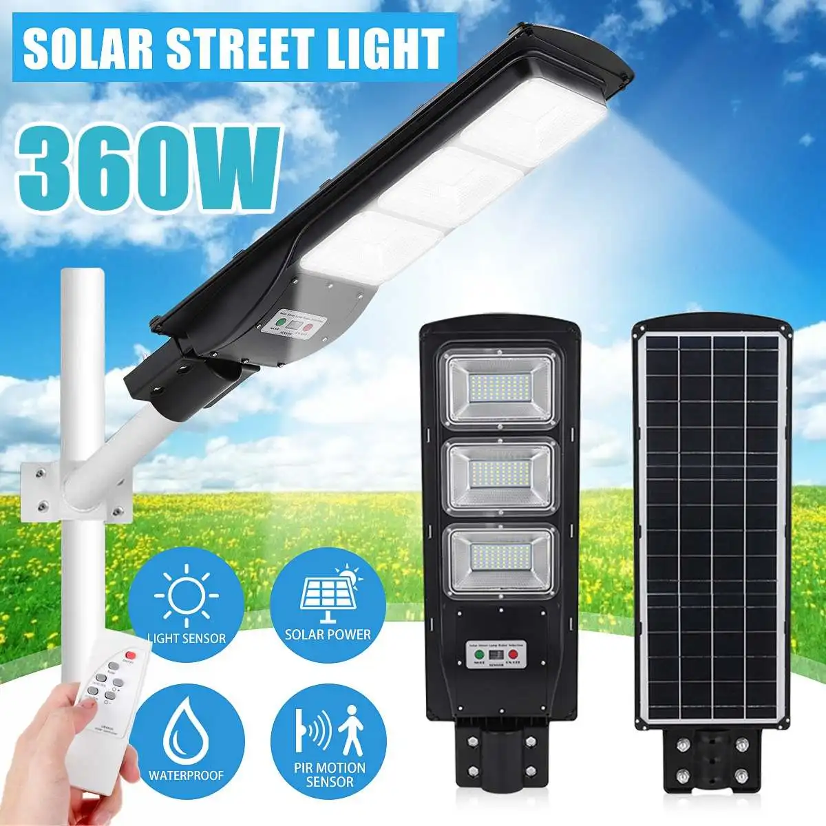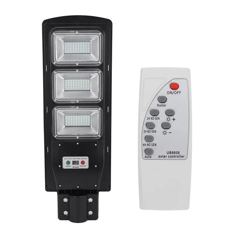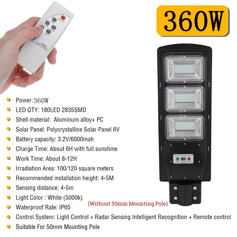 Характеристики:Мощность: 360 ВтСветодиодный Кол-во: 180 светодиодный 2835SMDМатериал корпуса: алюминиевый сплав + ПКПанели солнечные: поликристаллический кремний Панели солнечные 6VБатарея Емкость: 3,2 V/6000mahСистема управления: светильник + радар-датчик интеллектуального распознавания + пульт дистанционного управления(Весь светодиодный индикатор при обнаружении движения, 30%-ная мощность при отсутствии движения)Время зарядки: около 6 ч с полным солнечным светомВремя работы: около 8-12 чПлощадь облучения: 80/120 квадратных метровРекомендуемая высота установки: 3-5 мРасстояние срабатывания: 3-5 мСветильник Цвет: белый (5500k)Степень водонепроницаемости: IP65Подходит для крепежного полюса 50 смСветильник источник: 2835SMD светодиодный чип (180 шт.)Площадь облучения: 120 квадратных метровДлина монтажного полюса: 50 см
