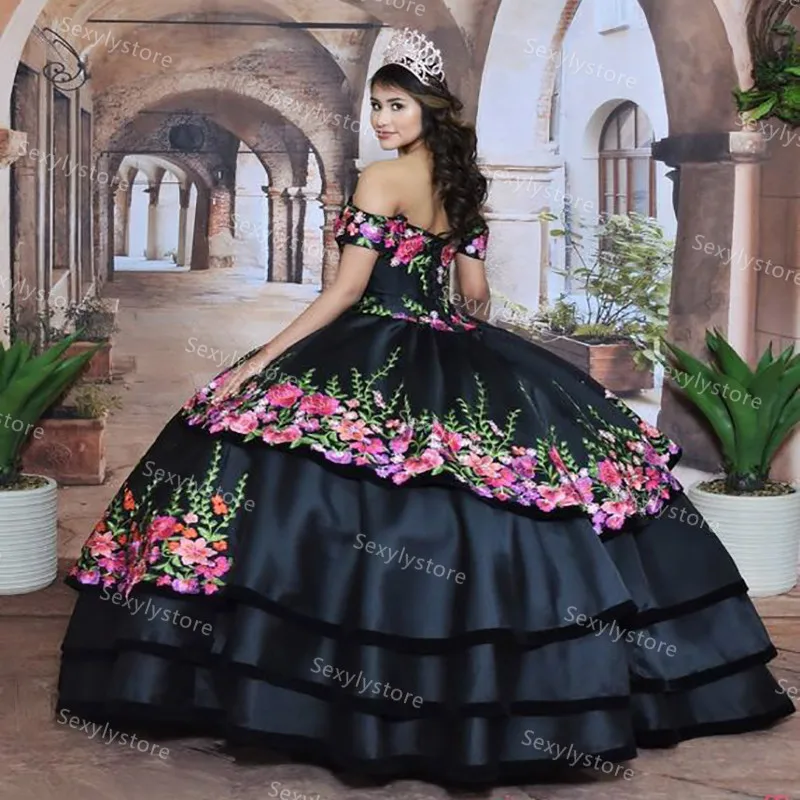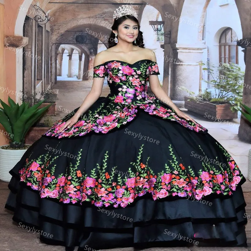 Черные мексиканские платья принцессы для Quinceanera 2020 с коротким рукавом винтажное бальное платье с цветочной вышивкой милые платья для выпускного вечера 15