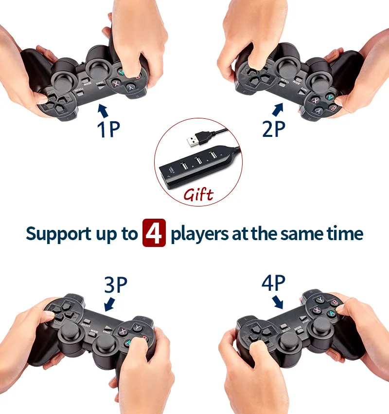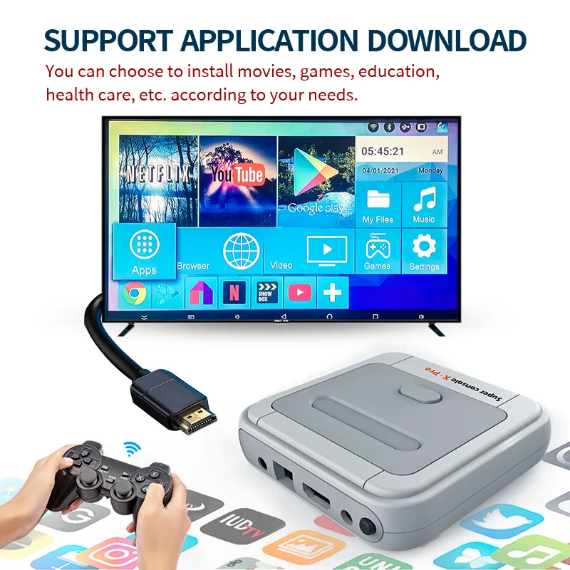 Особенности:Оснащен обновленной двойной системой, телевизионной системой и игровой системой. Поддержка игр, загрузка приложения самостоятельно, поиск информации с помощью goolge и просмотр ТВ онлайн. Такие богатые функции делают его хорошим помощником для наших развлечений и работы.Предустановлено 50 + эмуляторов и 50000 + (версия 256G) игр. Система linux с открытым исходным кодом, Модернизированный чип S905X, намного мощнее, решает проблему падения кадра, может отлично запускать 64-битные игры, такие как PSP/PS1/DC/N64/NDS/MAME и т. д. И это поможет сохранить ход игры в любое время. Очень удобно.Эта игровая консоль подходит для телевизора 4K, поддерживает соединение HD/AV, качество изображения высокой четкости 1080P, мы с легкостью сможем наслаждаться яркими и захватывающими видеоиграми на большом экране.Эта классическая игровая консоль поддерживает подключение к сети через LAN и Wi-Fi. Очень удобно загружать игры через сеть. Также вы можете добавить игры самостоятельно.Поддержка просмотра ТВ онлайн, очень полезно. Это лучший подарок для папы, детей, мужа и друзей.Характеристики:Количество игр: 33000 +,41000 +,50000 + для версии 64G, 128G, 256GЧипы: обновление до S905X, идеально решает проблему падения кадра, более плавная работа с 64-битными играми.Язык: 20 + поддерживаемых языковКомплектация:1 * супер консоль X-pro(64/128/256G опционально)2 беспроводных контроллера (батарейки в комплект не входят)1 * Адаптер питания1 * пульт дистанционного управления (батарейки в комплект не входят)1 кабель HDMI1 * usb-хабОтказ от ответственности:Система с открытым исходным кодом, не удаляйте необходимое содержимое sd-карты, если вы не знаете, что делаете, неправильная работа может привести к повреждению системы, И все ресурсы на консоли можно найти в Интернете, Мы не несем ответственности за содержание и то, что вы можете делать с этой консолью в будущем.Любые обновления «сделай сам» или приложения, которые вы добавляете в систему, могут привести к неожиданным результатам.