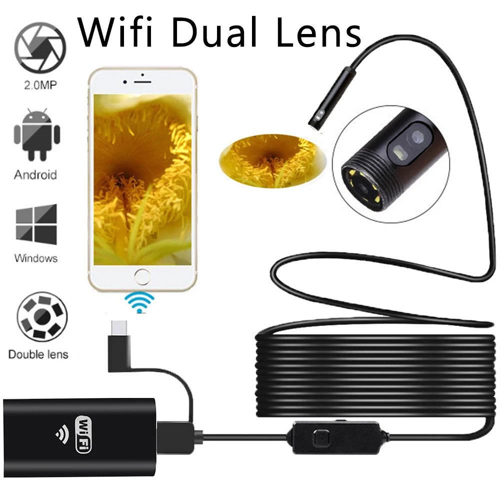Беспроводной двойной объектив промышленный эндоскоп USB Тип c трубка камера для осмотра автомобиля 8 мм бороскоп с экраном для телефона Android Iphone
