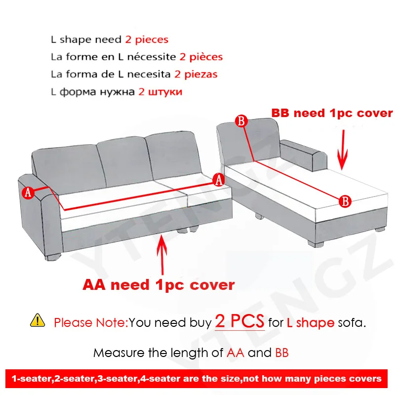 -Обратите внимание, что характеристики: 1 местный 90-140 см, 2 местный 145-185 см, 3 местный 190-230 см, 4 местный 235-300 см -Один чехол. Если у вас есть l-образный диван, вам нужно заказать 2 чехла. -Например: если AA = 145-185 см, BB = 190-230 см, вам нужно заказать (1 шт. 2-местный + 1 шт. 3-местный) -Если AA = 190-230 см, BB = 235-300 см, вам нужно заказать (1 шт. 3-местный + 1 шт. 4-местный) -Внимательно посмотрите на таблицу. Если вы не можете выбрать, напишите нам, мы вам поможем.
