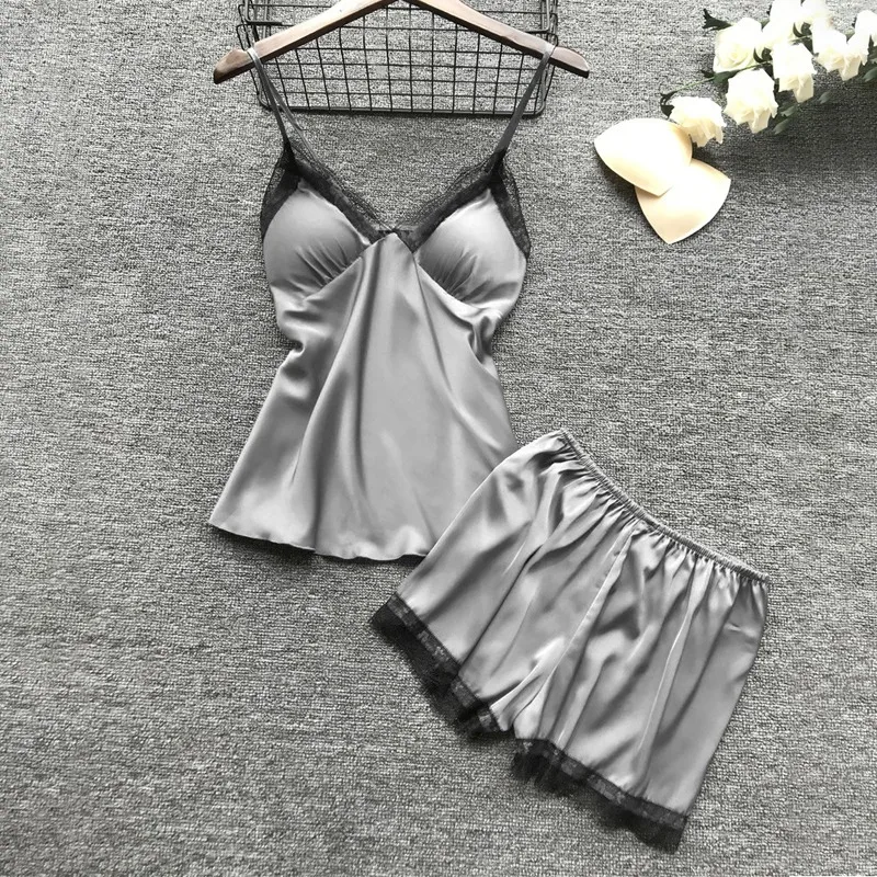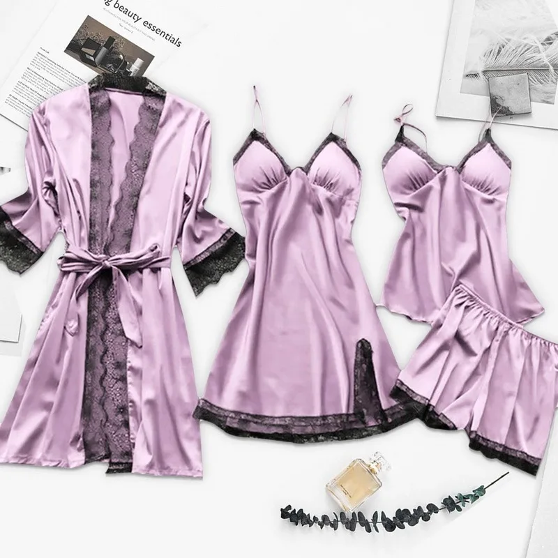 Пижамный комплект женский Шелковый, комплект из 4 предметов, кружевная атласная ночная рубашка с V-образным вырезом, ночная сорочка, одежда для сна, домашняя пижама, на весну