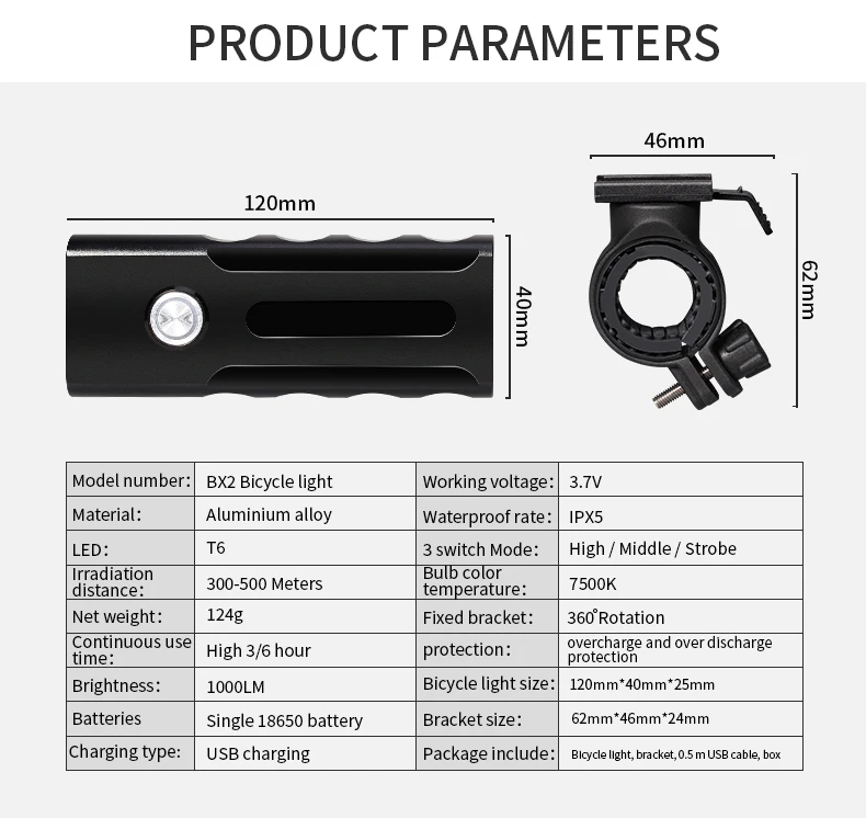 Класс водонепроницаемости-IPX3-IPX5. Не погружайте велосипедный фонарь в воду.