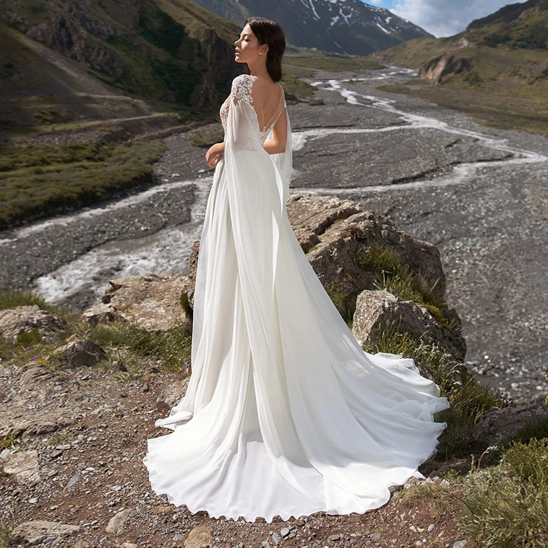 Шифоновые Свадебные платья с накидкой в богемном стиле, а-силуэт, с Боковым Разрезом, круглым вырезом, Кружевная аппликация, сексуальное свадебное платье с открытой спиной и шлейфом, 2021