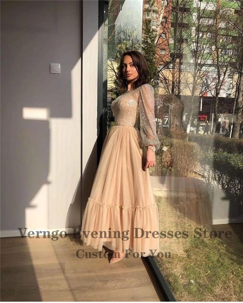 Verngo 2021 блестящие трапециевидные тюлевые платья цвета шампанского с длинными рукавами, прозрачные вечерние платья до щиколотки с глубоким вырезом для торжественных вечеринок