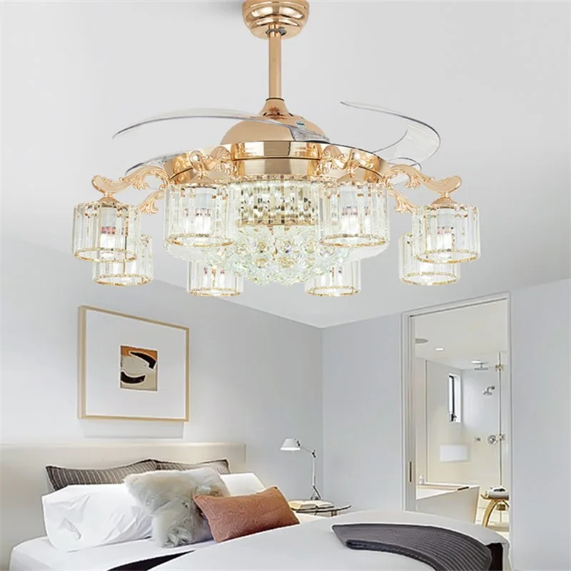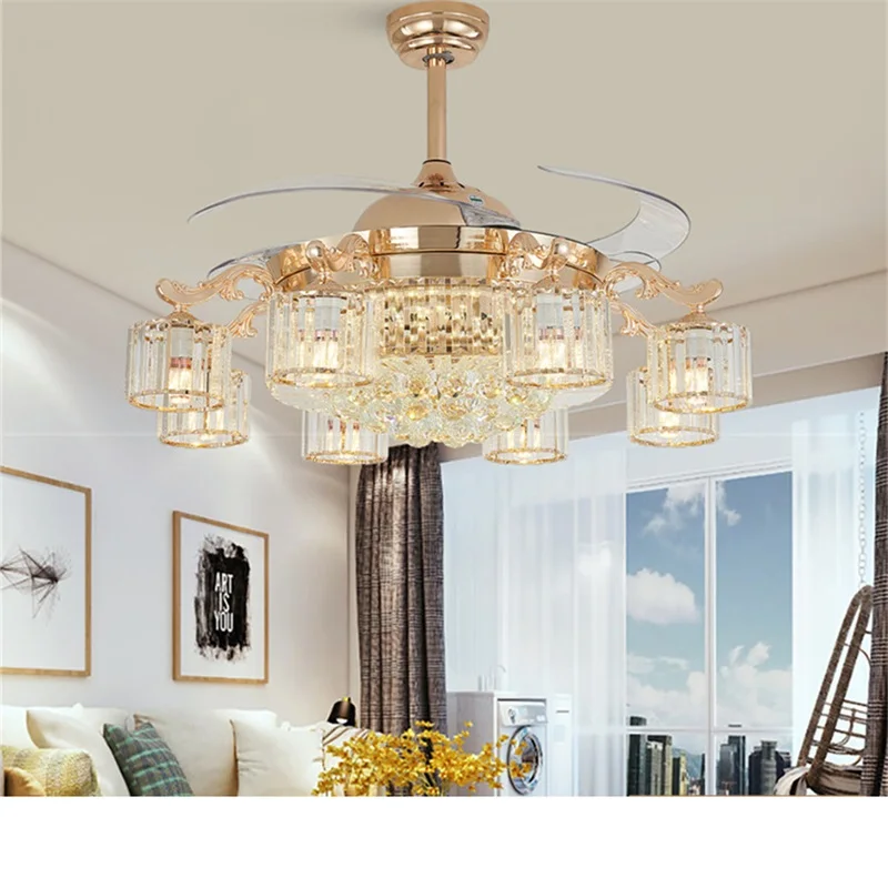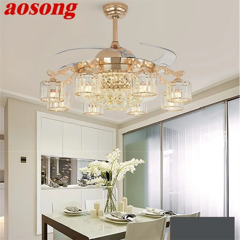 Потолочный вентилятор AOSONG, роскошная хрустальная лампа с дистанционным управлением, без лезвия, современное золото, для дома, столовой