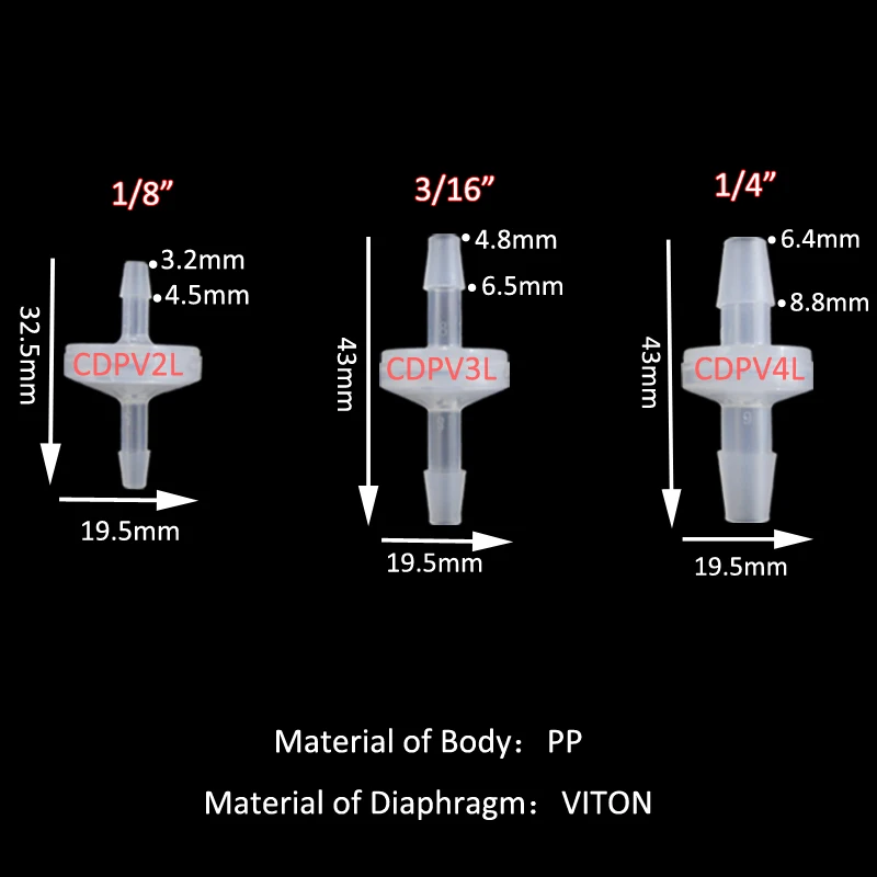 Материал корпуса: полипропиленМатериал диафрагмы: VITONРазмер порта: 1/8 "3/16" 1/4"