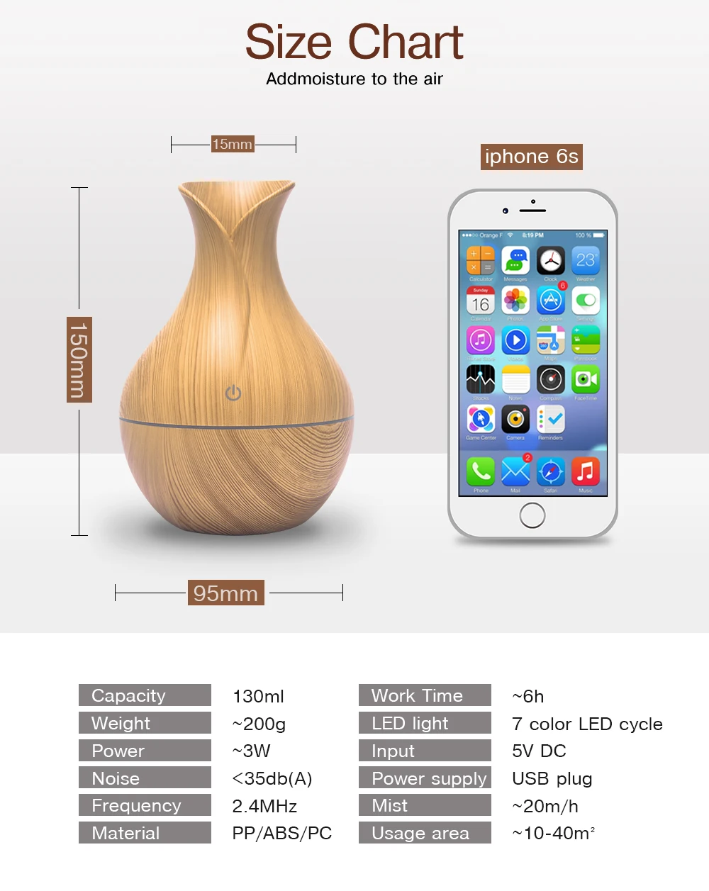 Спецификация: Тип: ультразвуковой увлажнитель воздуха Материал: АБС + ПП Количество: 1 шт. Цвет: светильник, цвет дерева/цвет темного дерева Режим: Нажмите кнопку питания для непрерывной работы Светодиодный Цвет: синий Емкость увлажнителя: 130 мл Объем распыления: ≥ 30 мл/час Адаптивная площадь: 20-30 квадратных метров Тип разъема: USB Напряжение: 5 В постоянного тока Частота: 50/60 Гц Мощность: < 2 Вт Сертификация: CE, ROHS Размер изделия: 95*100 мм Чистая Вес: 0,175 кг/5,1 oz Продукт содержит: 1 * ультразвуковой увлажнитель воздуха 1 * USB кабель питания Примечание: Наши продукты были модернизированы. Для того, чтобы продлить срок службы продукции и изменить традиционное хлопковое оборудование, Теперь вам нужно наклонить ватные тампоны и вытянуть их. Если вы не используете их, пожалуйста, свяжитесь с нашей службой поддержки клиентов! Большое спасибо!