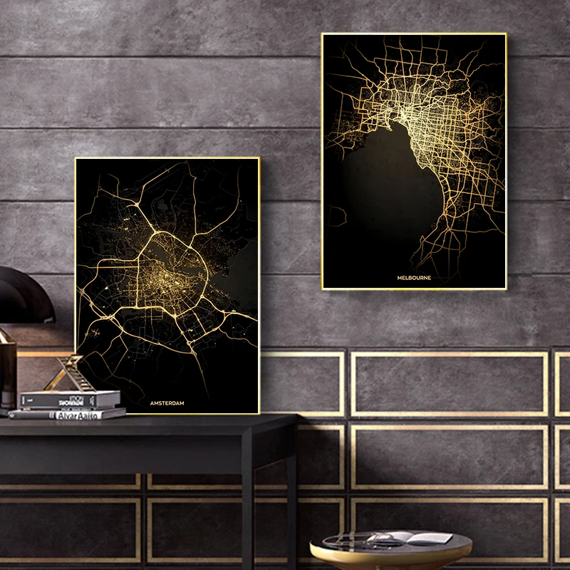 Nordic золотистый и черный карта городов мира Wall Art Холст Картина Париж Лондон Плакаты и принты настенные картины для Декор в гостиную