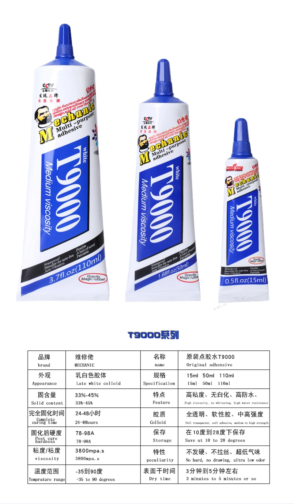 T-9000-это пластик и пластик, пластик и металлический склеивание клея, может быть скреплен PP / PE пластик не нужно делать любую обработку может быть непосредственно скреплен новый продукт, при склеивании акрила и пластика не будет влиять на коррозию.