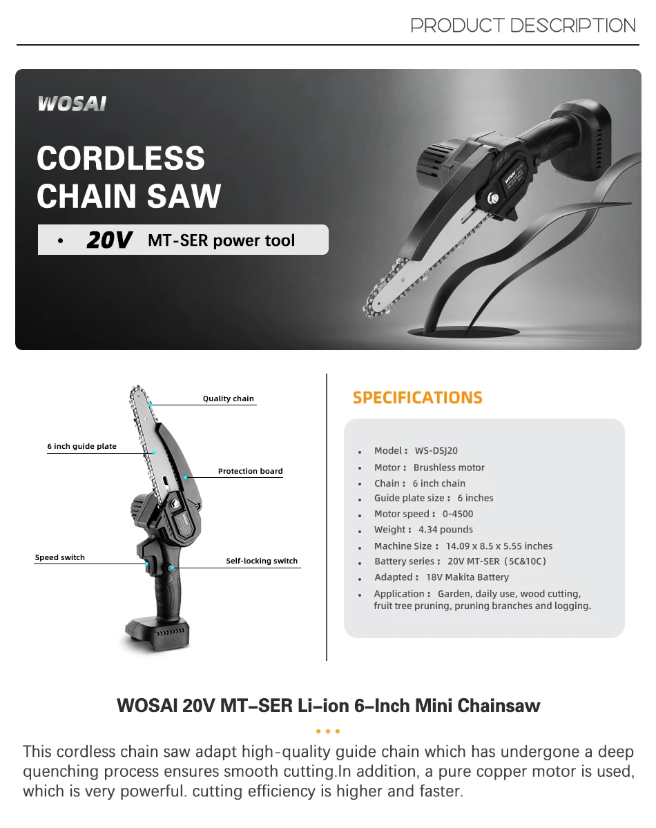 WOSAI 6 дюймов 20 в MT-SER мини бесщеточная Электрическая цепная пила ручная Обрезка с деревообрабатывающей обрезкой с одной рукой садовые инструменты