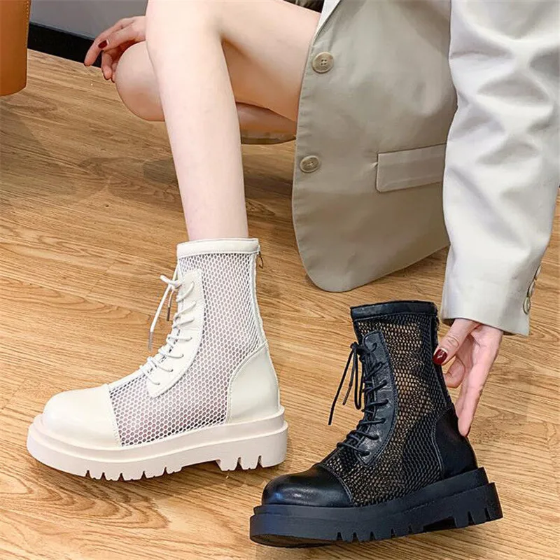 Ботинки сетчатые женские, на шнуровке, дышащие, черные, на квадратном каблуке
