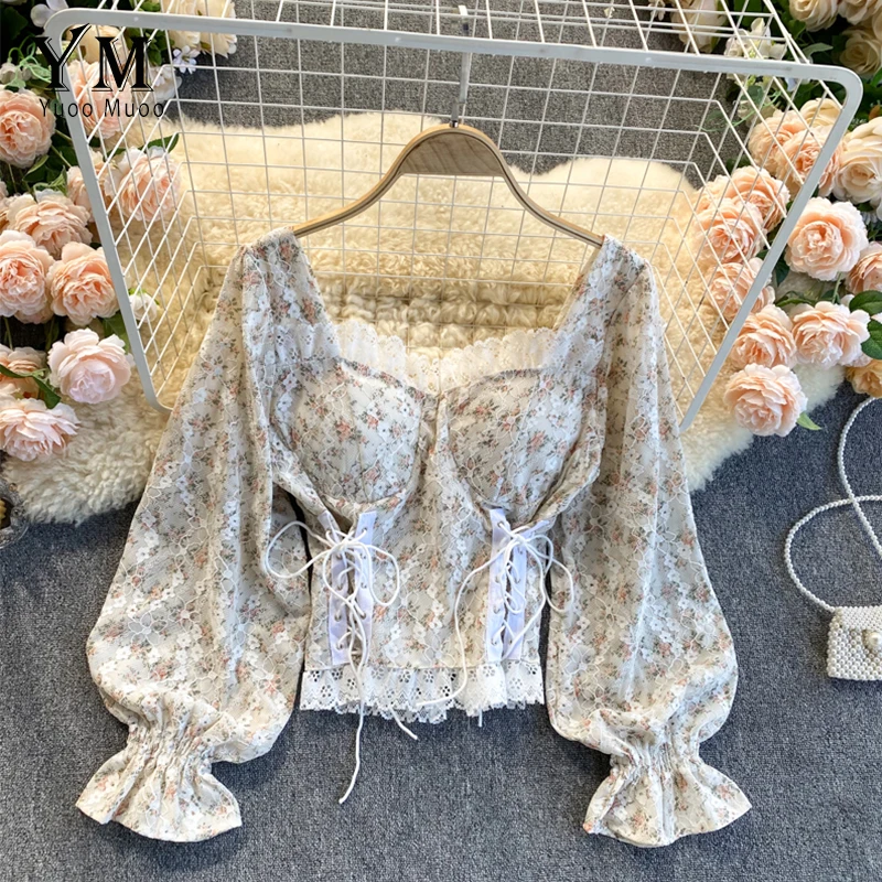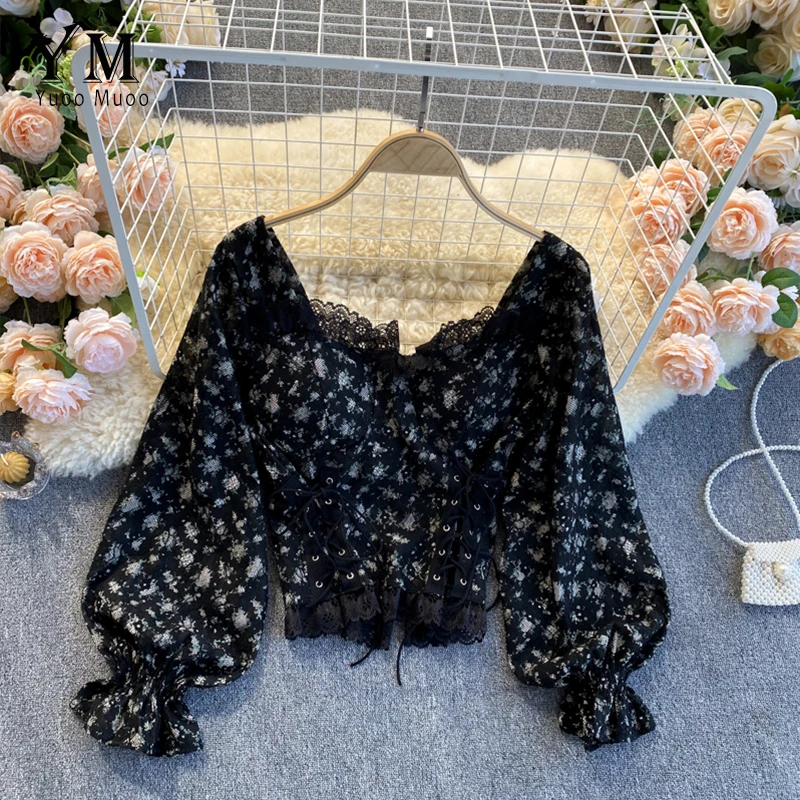 Женская блузка в стиле ретро YuooMuoo, черно-белая блузка с цветочным принтом на раннюю осень 2021
