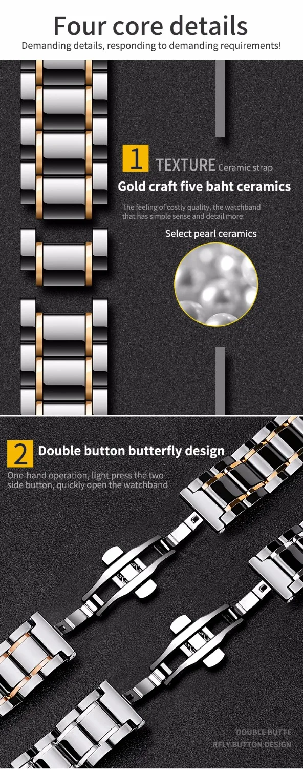 Ремешок изготовлен из комбинации керамики и нержавеющей стали, предназначен для часов oppo 41 мм/46 мм. -Быстросъемный дизайн: высококачественный керамический ремешок для часов с быстроразъемным дизайном, элегантный, модный и удобный в носке. С быстроразъемными пружинными пружинами, просто установите и отсоедините ленту вручную, никаких инструментов не требуется; 3 быстроразъемных штифта в комплекте (2 для прямого использования и 1 для запасных). -Длина регулируется: все керамические звенья съемные, очень легко удалить звенья, чтобы изменить размер браслета, чтобы идеально подогнать запястье. В комплект входит инструмент для удаления звеньев. Подходит для всех запястья размером менее 8,6 "(220 мм). Длина ремешка: 6,7 "(170 мм) длина ремешка может быть увеличена, чтобы удовлетворить потребителя (большая рука запястья), толщина: 3,8 мм, Вес: около 2,8 унций.(80 г). -Серебристая застежка-бабочка из нержавеющей стали: Высококачественная застежка-бабочка из нержавеющей стали с двойной кнопкой позволяет быстро снять и снять ремешок. Застежка/пряжка с двумя кнопками обеспечивает безопасность Ваших часов и «щелчком» быстро отпустите и закройте их.
