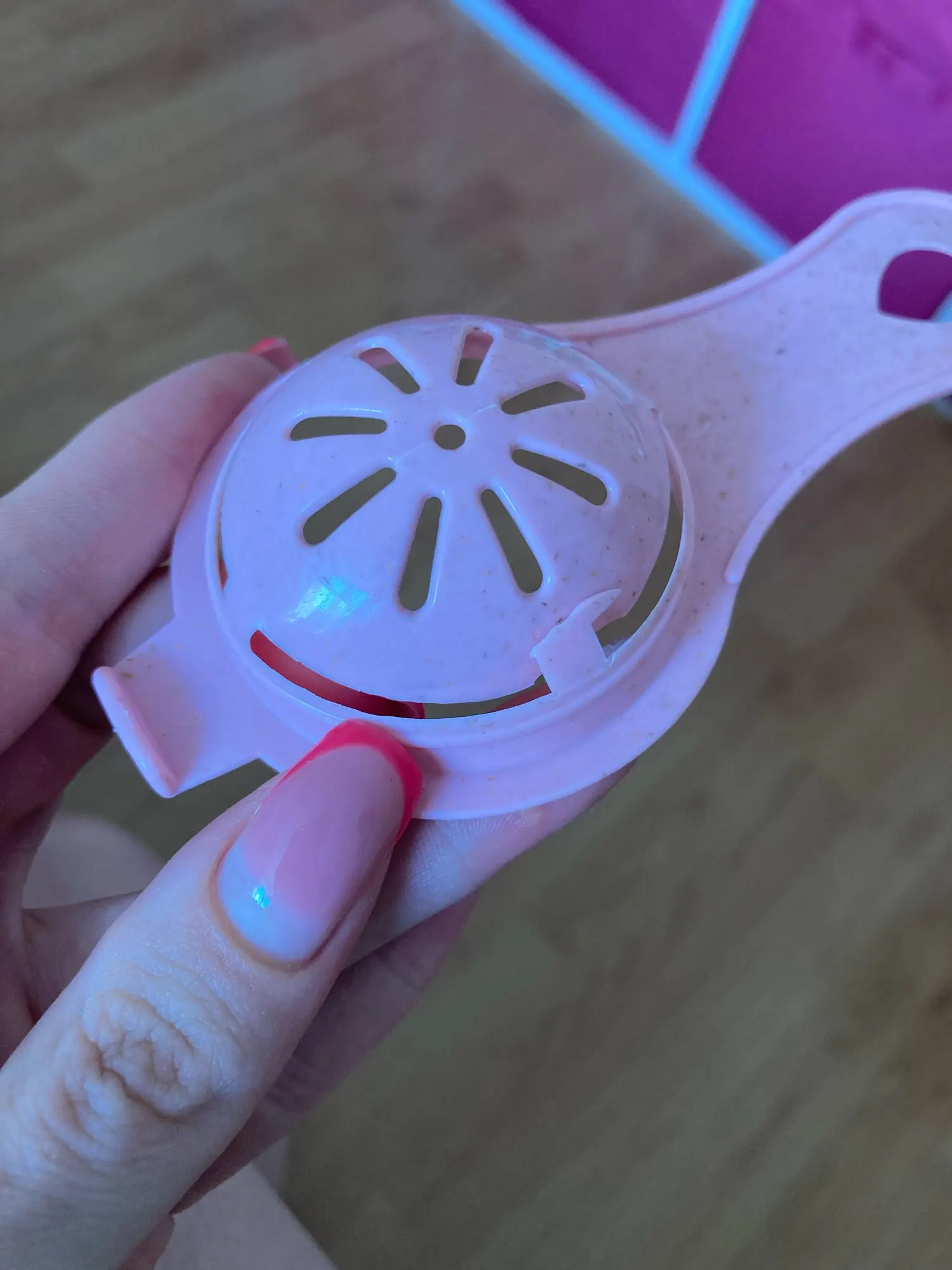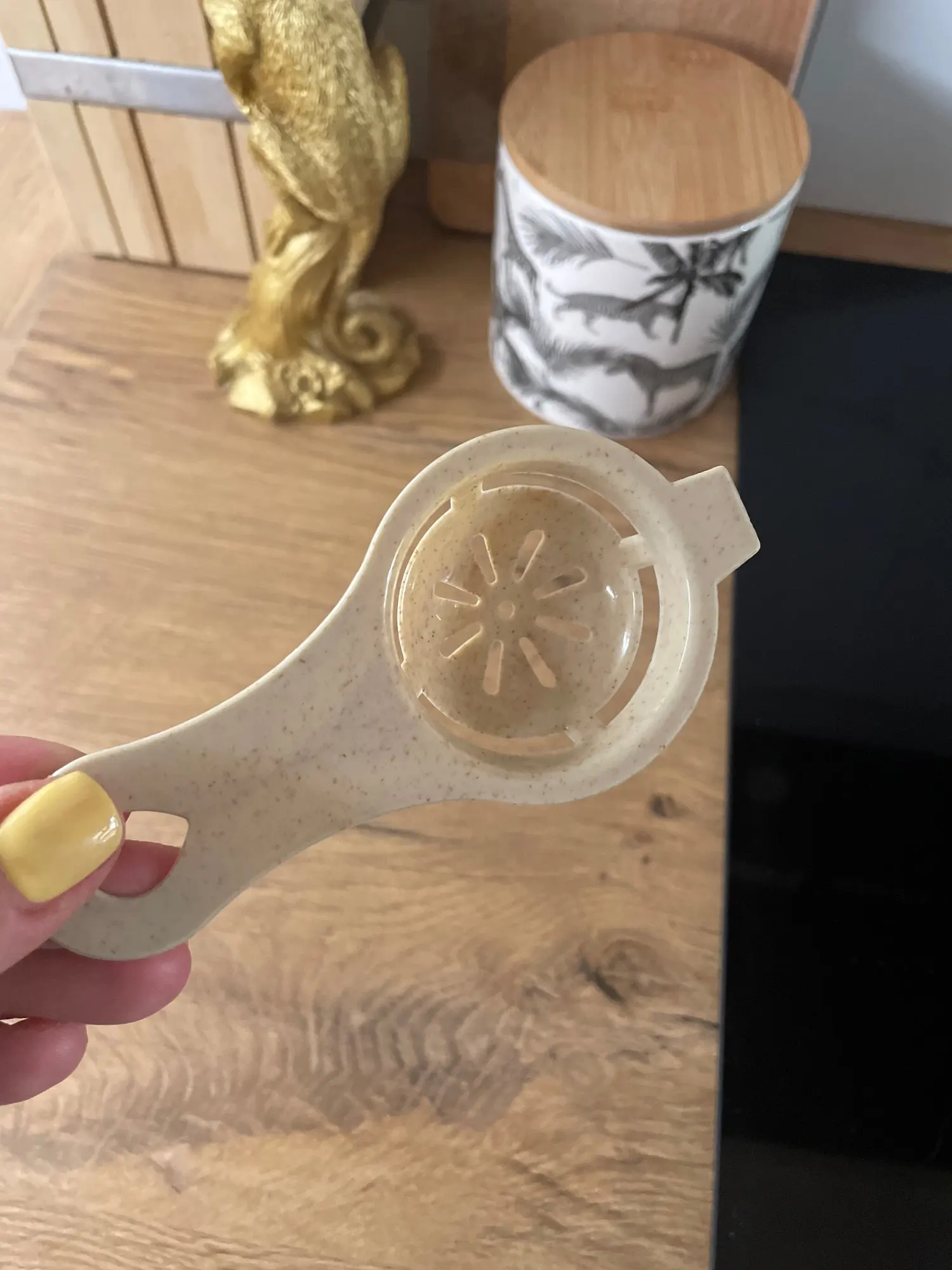 приятный пластик, крепкий, инструмент устойчивый, белок стекает туго, приходится немного помогать, но, в любом случае, удобно