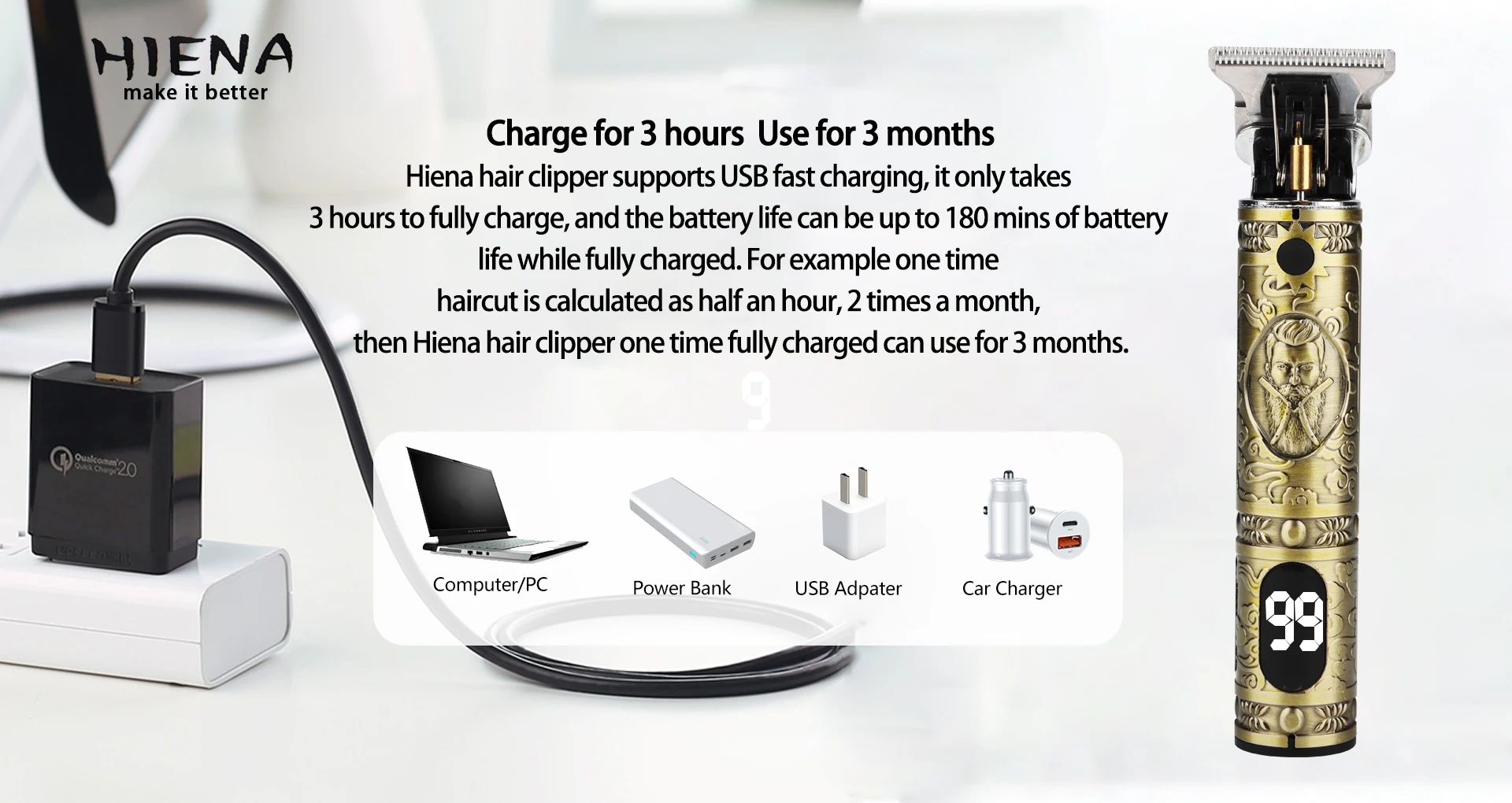 Hiena машинка для стрижки волос поддерживает быструю зарядку через USB, для полной зарядки требуется всего 3 часа, а срок службы батареи может достигать 180 минут автономной работы при полной зарядке. Например, один раз стрижка рассчитывается как полчаса, 2 раза в месяц, затем Hiena машинка для стрижки волос один раз полностью заряженная может использоваться в течение 3 месяцев.