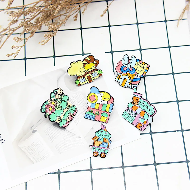 Мультяшная эмалированная брошь в виде домика для напитков, мороженого, пекарни, цветов, магазина, вырезания волос, заколка для лацкана больницы, клиники, модный значок