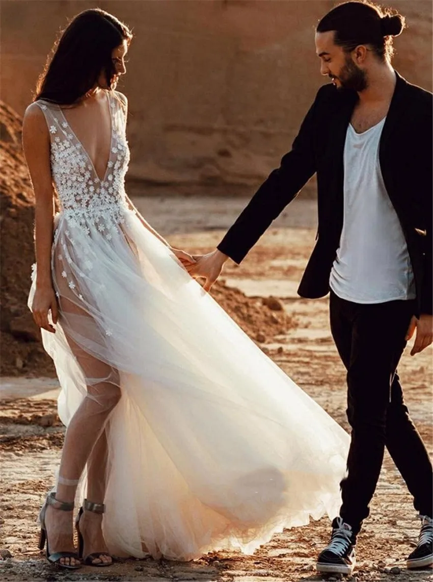 Сексуальное пляжное свадебное платье с глубоким V-образным вырезом и разрезом по бокам до пола, кружевное свадебное платье без рукавов, 2021 тюль, ТРАПЕЦИЕВИДНОЕ ПЛАТЬЕ