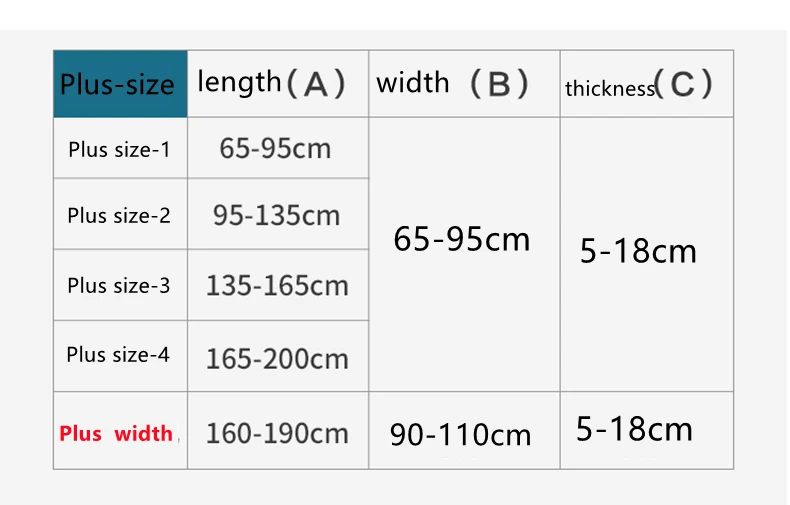 Обычный размер-1: длина 50-70 см, ширина 50-70 см, толщина 5-18 смНормальный размер-2: длина 100-120 см, ширина 50-70 см, толщина 5-18 смНормальный размер-3: длина 150-190 см, ширина 50-70 см, толщина 5-18 смНормальный размер-4: длина 230-280 см, ширина 50-70 см, толщина 5-18 смПлюс размер-1: Длина 65-95 см, ширина 65-95 см, толщина 5-18 смПлюс размер-2: длина 95-135 см, ширина 65-95 см, толщина 5-18 смПлюс размер-3: длина 135-165 см, ширина 65-95 см, толщина 5-18 смПлюс размер-4: длина 165-200 см, ширина 65-95 см, толщина 5-18 смПлюс ширина Размер: длина 160-190 см, ширина 90-110 см, толщина 5-18 смЭтот размер большой ширины используется для угловой подушки для дивана