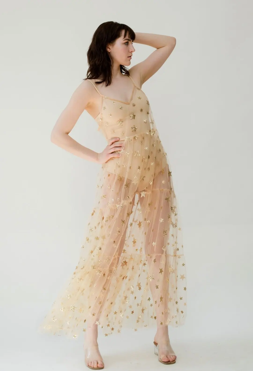 Милое прозрачное Сетчатое бикини на бретельках для женщин и девочек, накидка без рукавов с блестками и принтом звезд, длинные платья на бретельках, пляжная одежда