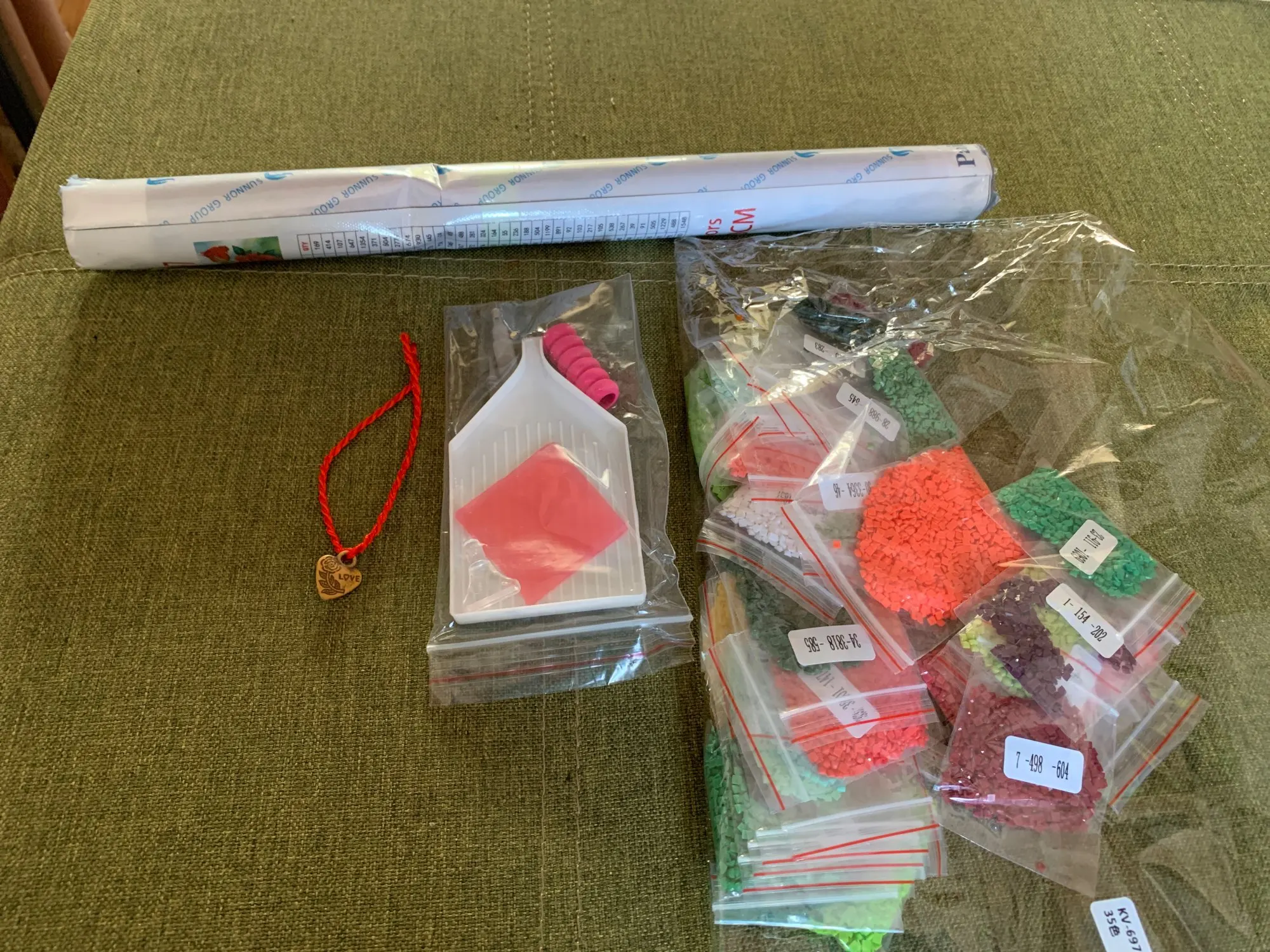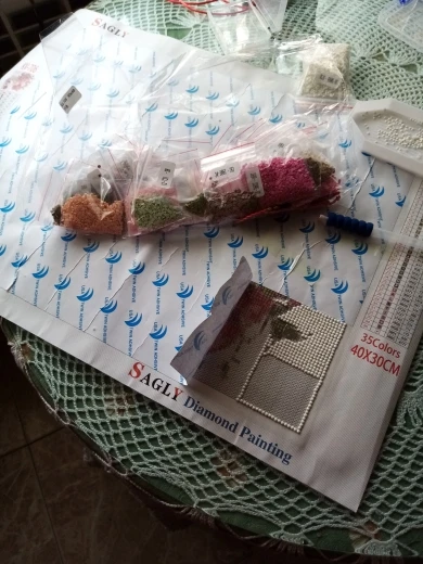 пришла сама картинка на ткани с липким слоем, размером с альбомный лист, аккуратненько намотанная на вспененый валик. 30 пакетиков с крошечными квадратиками (ожидала что они будут покрупнее - работа будет очень мелкая, реально ювелирная)) ), лоточек все остальные прибамбасы по описанию. всё целое, аккуратное. брала в подарок