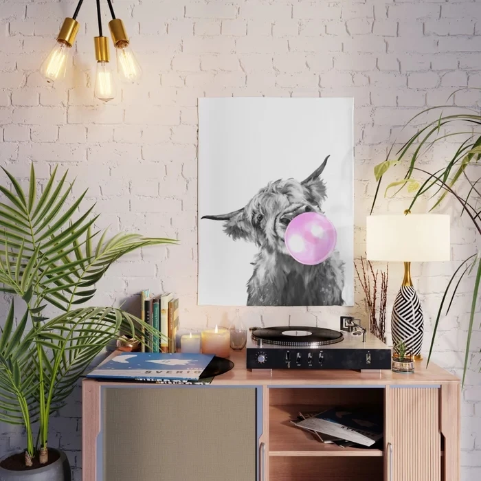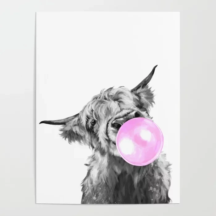 Печатные плакаты на стену с изображением пузырчатой жвачки Highland Cow, модульные картины на холсте, черные и белые домашние фоны, декор для гостиной