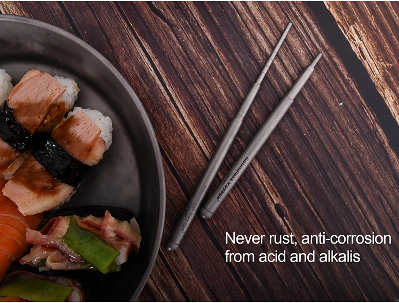 Особенности:1. Изготовлен из премиум титана, он легкий, никогда не ржавеет, антикоррозийный от кислоты и щелочи, устойчивый к царапинам и термостойкий.2. В наконечнике палочек для еды используется Нескользящая конструкция катушки для увеличения трения, что облегчает получение пищи.3. Палочки для еды гибкие, максимальная длина 19,8 см, минимальная длина 8 см, они достаточно длинные для взрослых при использовании, и они достаточно короткие, чтобы сэкономить больше места при хранении.4. Палочки для еды могут быть легко разделены на три отдельных секции, каждая секция очень легко моется и не оставляет грязи.