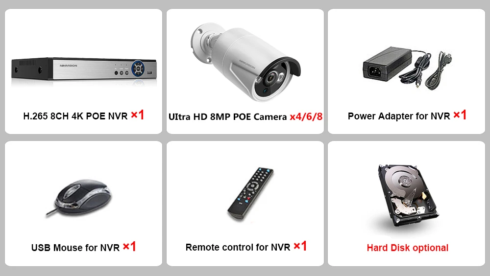 1 сетевой видеорегистратор 8CH 4K POE NVR;4/6/8 X HD POE IP 8.0MP Крытый Открытый ИК День ночного видения атмосферостойкие камеры;1 X Блок питания для NVR;1 х USB мышь для NVR;1 компакт-диск программного обеспечения для NVR;1 пульт дистанционного управления для NVR;Жесткий диск опционально!