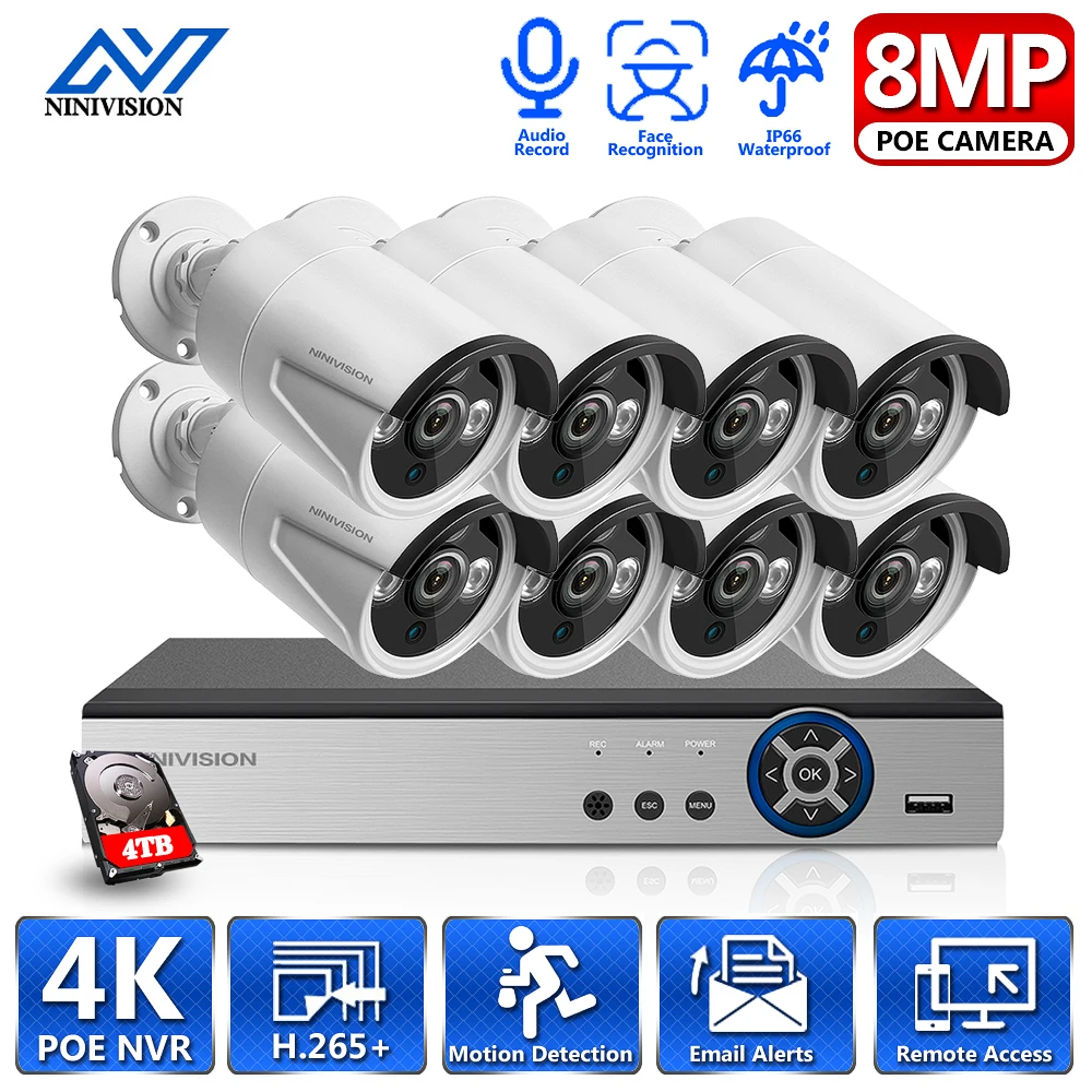 NINIVISION камера видеонаблюдения системы безопасности комплект 8CH 4K POE NVR комплект Открытый водонепроницаемый Ai аудио видео наблюдение POE IP камера система набор 8MP