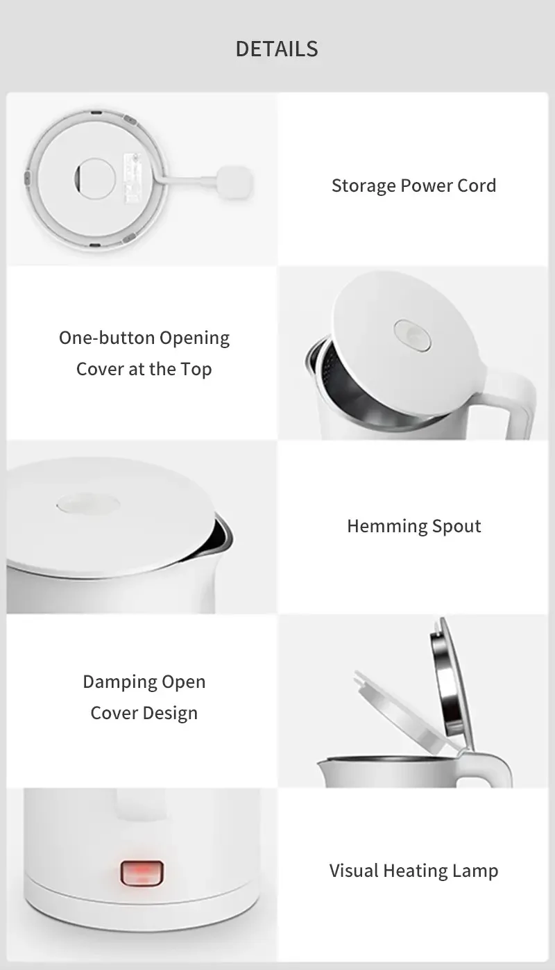 Основные характеристики:● Высокая мощность 1800 Вт, быстрое кипячение● Двухслойная структура внутри и снаружи, которая является Полой и не горячей● Термостат британского бренда для обеспечения полной варки горячей воды● Конструкция большого размера для более легкой очистки● Автоматическое выключение после кипения, автоматическое выключение при недостатке воды, разъем питания для предотвращения электрического удара, автоматическое отключение при поднятии горшка, чтобы предотвратить пустое горениеПараметрыБренд: MijiaМодель: MJDSH02YMМатериал: PP + 304 нержавеющая стальЕмкость пылесборника: 1,5 лМощность: 1800 ВтНапряжение: 220 ВВилка: вилка CNВес продукта: 1,10 кгСодержимое посылкаКорпус чайника-1 шт.1 х блок питания1 х Руководство