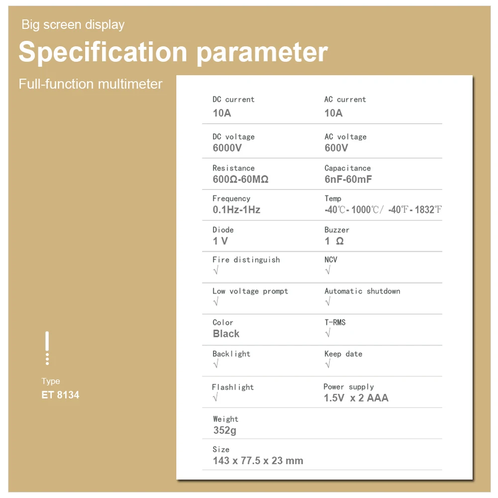 Цифровой мультиметр TOOLTOP ET8134, Измеритель постоянного тока, напряжения и переменного тока, 4,7 дюйма
