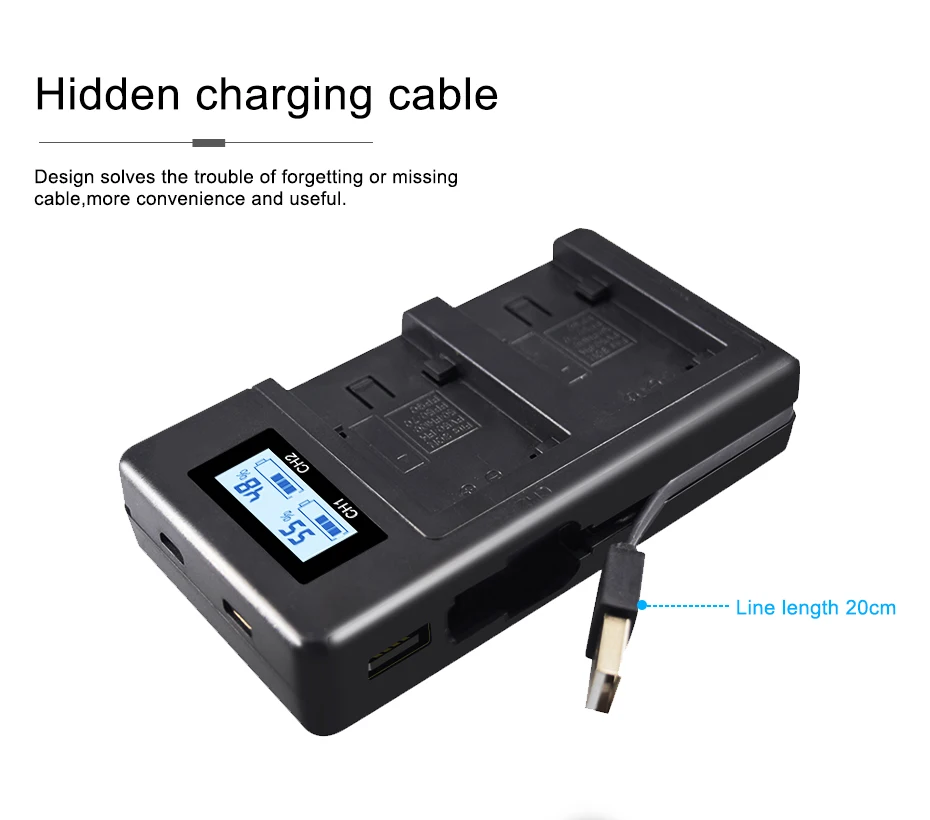 Доставка 24 дня, отслеживался весь путь. Зарядка в картонной коробке, сверху чёрный пакет с надписями логотипа производителя. Никакой воздушно-пузырьковой плёнки, зарядка свободно болтается внутри коробки. Товар соответствует описанию, есть инструкция на английском и китайском языках. У зарядки несколько вариантов подключения блока питания (обычный USB, USB Type-C и micro USB). Стандартный USB сделан в виде выносного кабеля, который намотан вокруг зарядки. Протестировано с оригинальными аккумуляторами Sony NP-FV30. Индикатор отображает процесс заряда каждого аккумулятора по отдельности, белая подсветка светится несколько секунд (загорается при добавлении / извлечении аккумулятора и USB кабелей с блоком питания или нагрузкой), гаснет автоматически. При отключении блока питания зарядка может использоваться как PowerBank и будет показывать процент заряда каждого аккумулятора, который будет уменьшаться по мере их разряда. Товар рекомендую, продавец общительный.