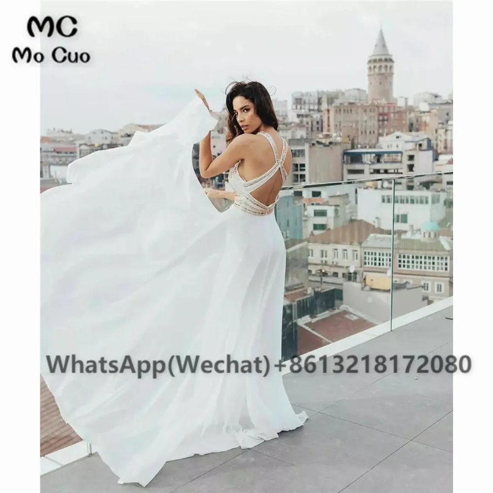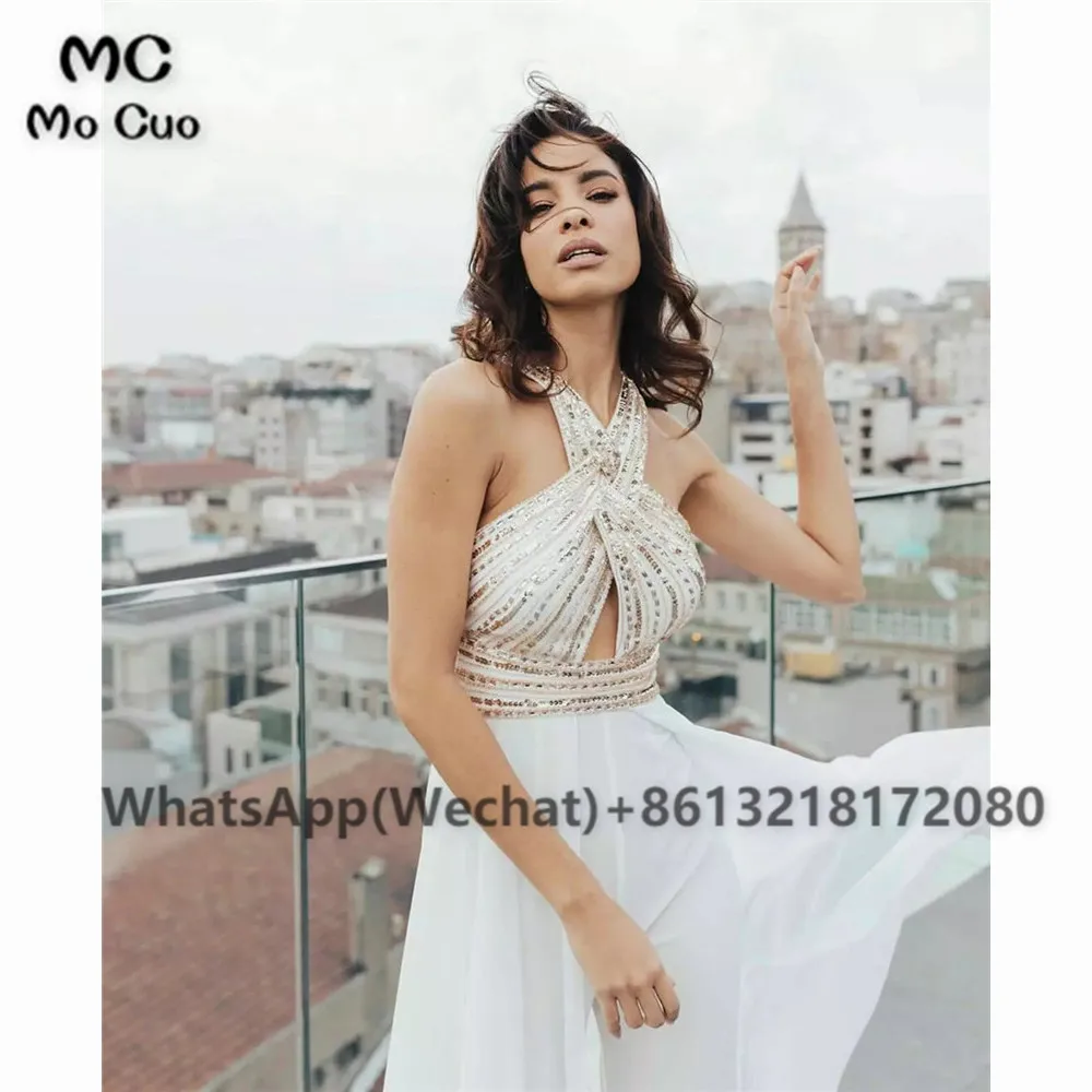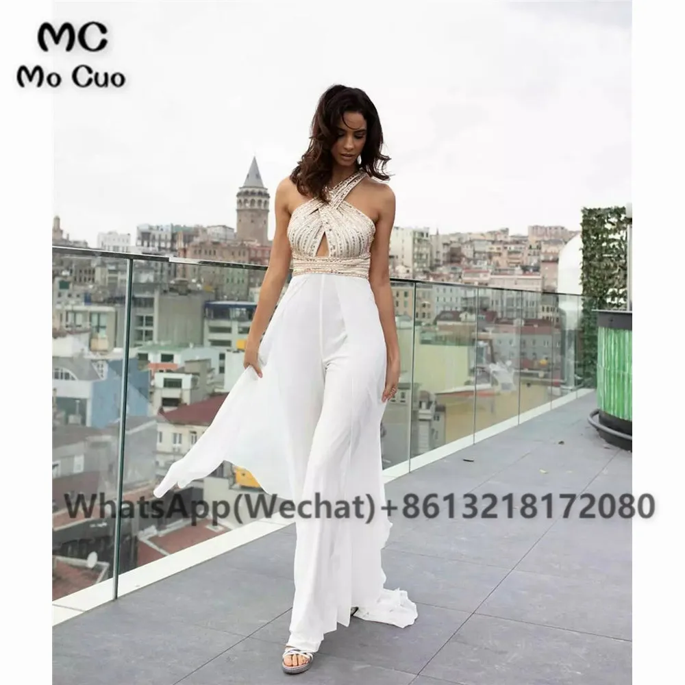2021 Женский Длинный Шифоновый комбинезон с кристаллами и бусинами, пляжные свадебные белые свадебные платья