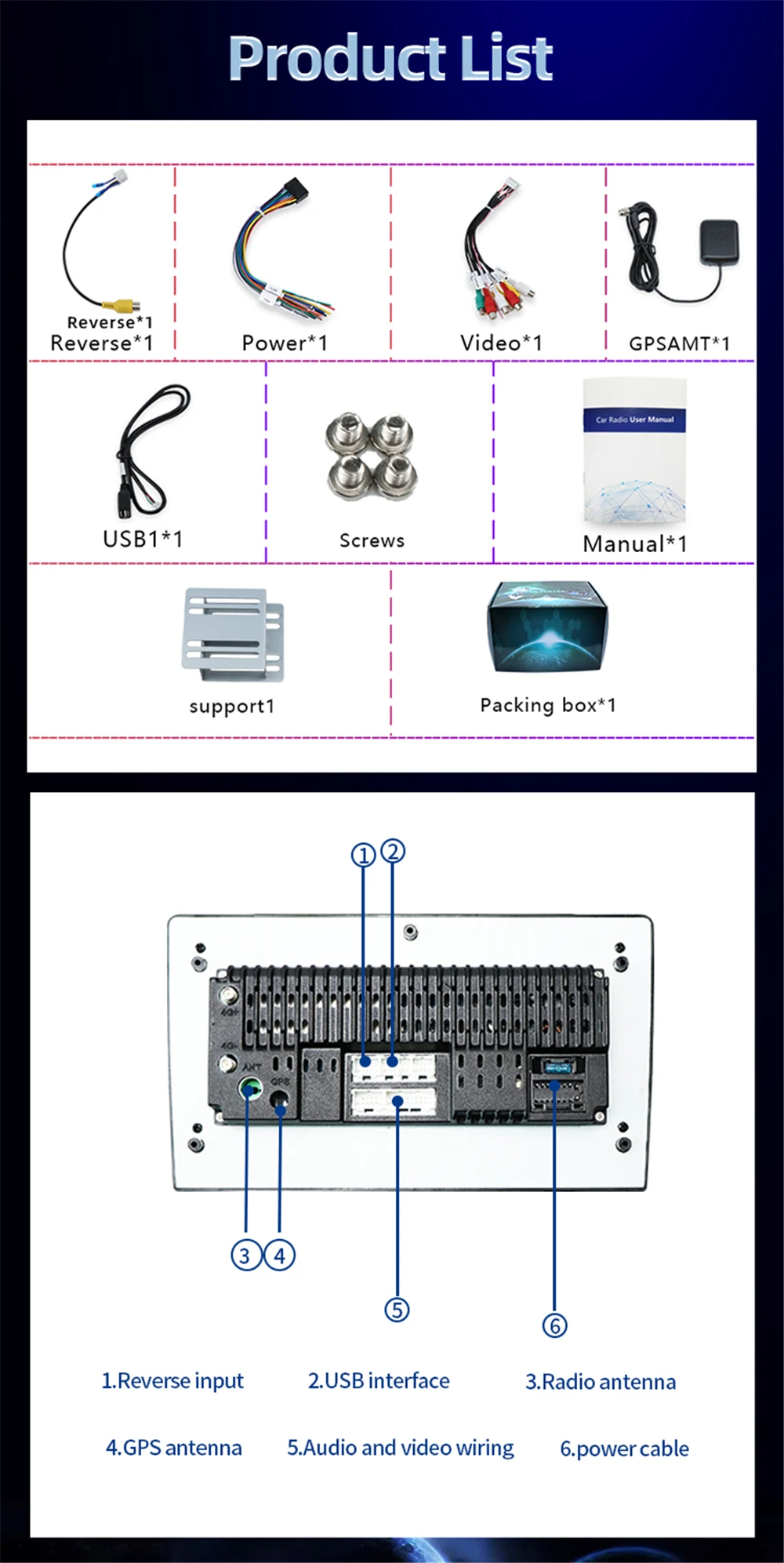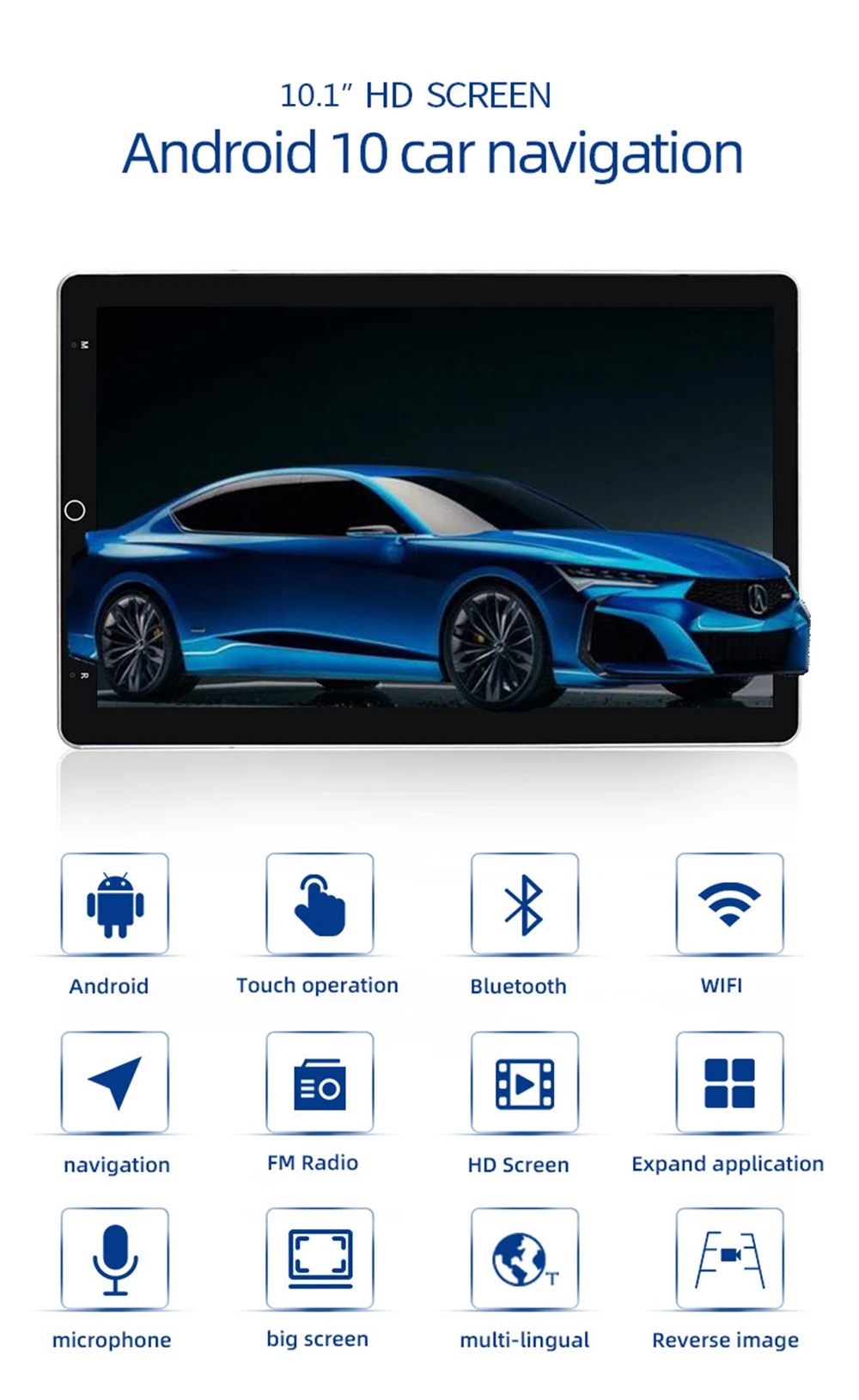 Технические характеристики1. Операционная система Android 102. ЦП: A7 1.3GHZx43, встроенная память DDR3 2G 32G/16G4, поддержка USB входа5. Экран Размер: 10,1 дюймов, Мощность Вход: 4*45 Вт, Экран: емкостный сенсорный экран Экран, Вход: 12 в пост. Тока