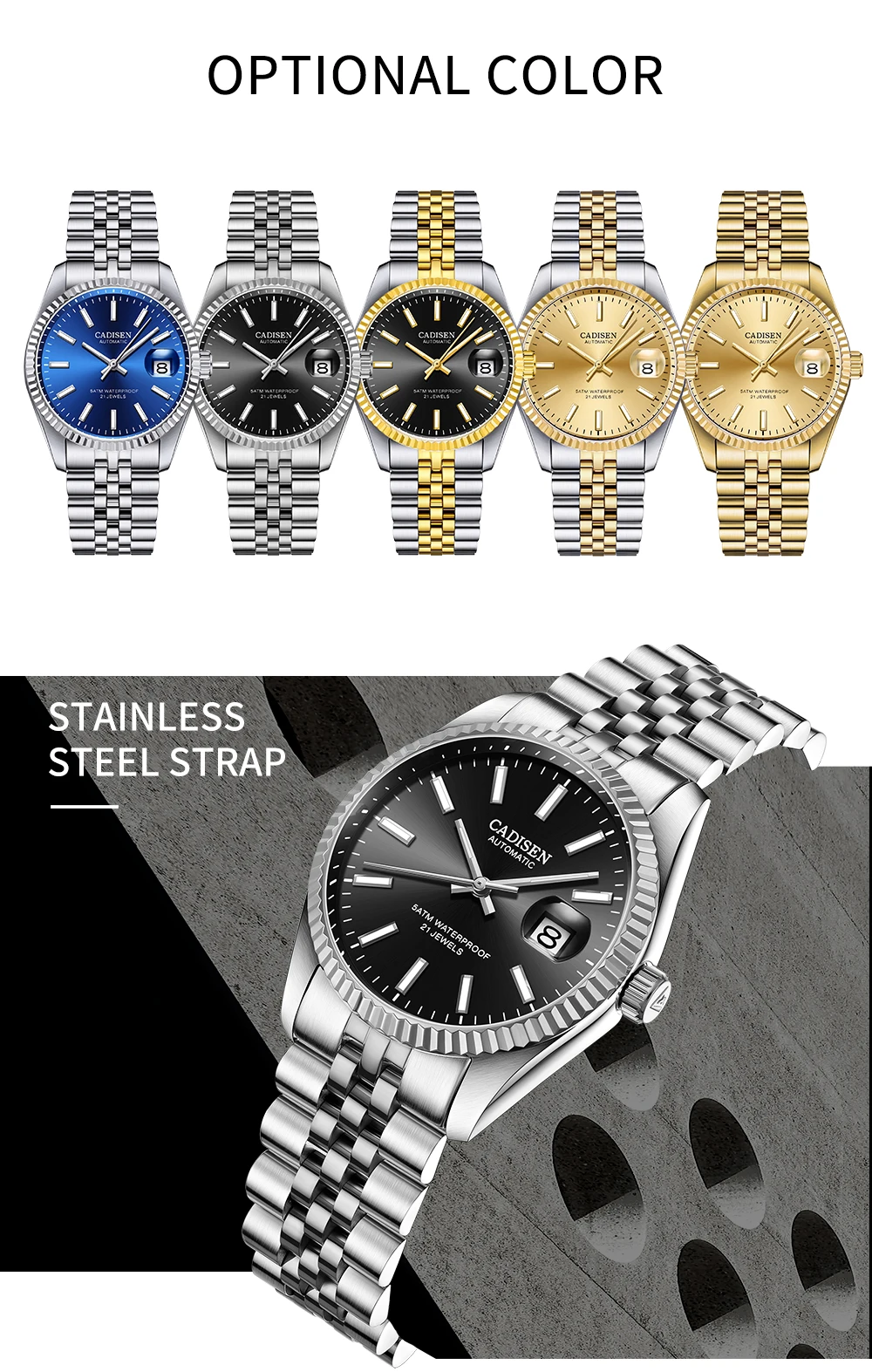 Мужские механические часы CADISEN MIYOTA 8215, автоматические часы из нержавеющей стали, Топ бренд класса люкс, водонепроницаемые мужские часы DatejustОписание:-100% новый и высокое качество.-Автоматические механические часы MIYOTA 8215. Для точного хранения времени.-Чехол из нержавеющей стали 316L и ремешок для часов из нержавеющей стали.-Сапфировое зеркало, устойчивое к царапинам.-Водонепроницаемость на глубине 50 м.Характеристики (прибл.):-Корпус Диаметр: 3,8 см прибл.-Корпус Толщина: 1,2 см прибл.-Длина ремешка (включая чехол): около 21 см-Ремешок Ширина: 2,0 см прибл.-Вес часов: 128 г.Посылка включает в себя:-Новые часы One CADSIEN-Одна коробка.-Руководство по эксплуатации, гарантийный талон.-Одна тканевая салфетка для чистки часов