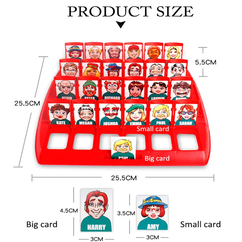 Описание: Интерактивная настольная игра для семьи Как играть шаги: 1. Игрок перемещает маленькую карту и большую карту отдельно, а карты лицевой стороной вниз, отличается цветом задней части, красный-24 карты, синий-24 карты, количество небольших карт и больших карт одинаковое; 2. Два игрока рисуют карты (большие карты), и один вечерние начинает задавать вопросы. Ответ на вопрос может быть только: да или нет, например, вопрос: это желтые волосы, B ответы, нет, желтые волосы на игровой доске должны быть закрыты; 3. У каждого человека есть только одна возможность задать вопросы. Если ответ да, вы можете продолжать спрашивать, если ответ нет, вы можете задать другие вечерние вопросы; 4. Когда у игрока есть только одна дверь, оставленная на игровом поле, он может выкрикнуть имя персонажа на двери. Если карта соответствует персонажу на двери, он может записать ее на правой стороне игрового табло; Игрок, который докажет, что пять символов быстро выиграют.