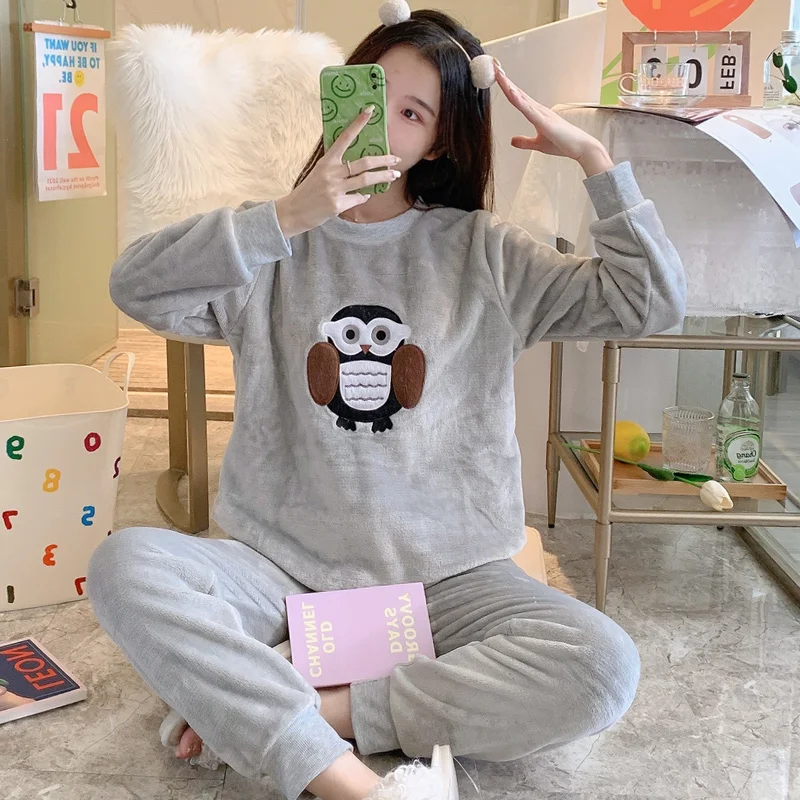Корейская мода, фланелевый Пижамный костюм, Женская Повседневная осенне-зимняя Пижама, ночная рубашка, комплект домашней одежды из 2 предметов, коралловый флис, Рождественский спортивный костюм
