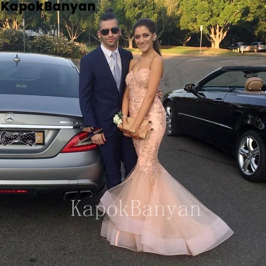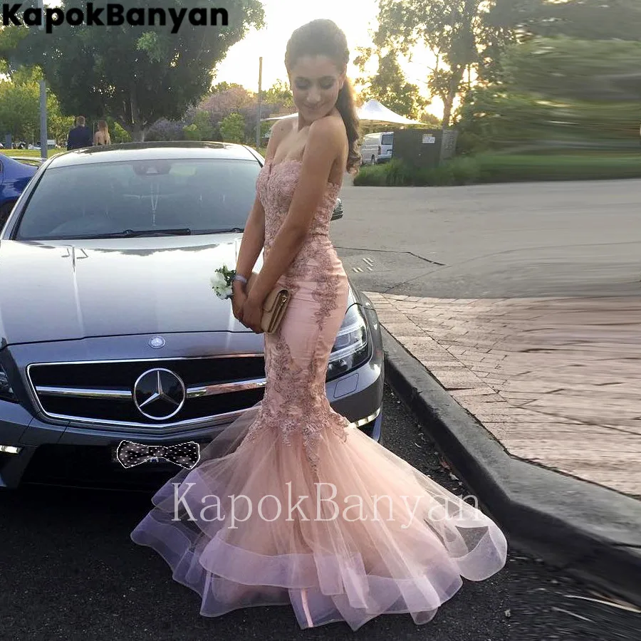 С кружевными аппликациями, слоями органзы Русалка платье для выпускного вечера без бретелек на молнии лиф Вечерние платье развертки Поезд