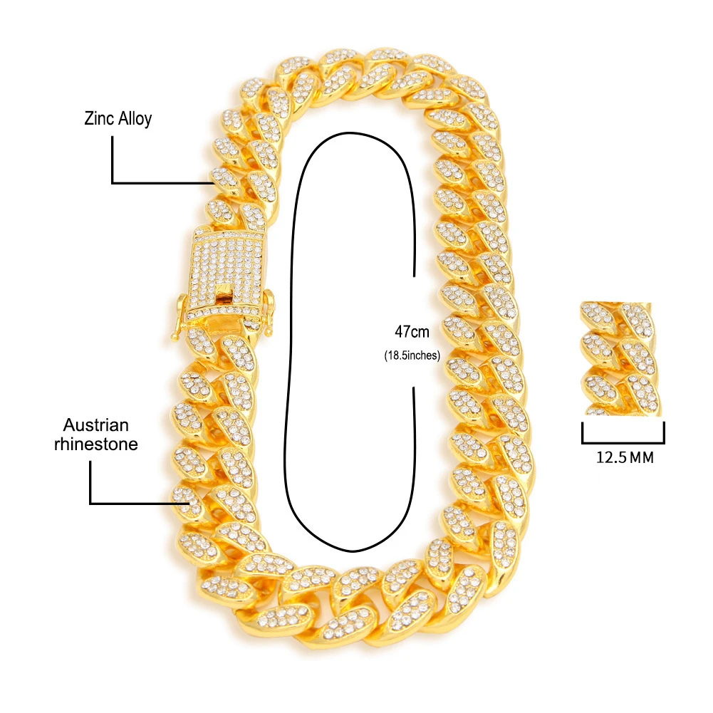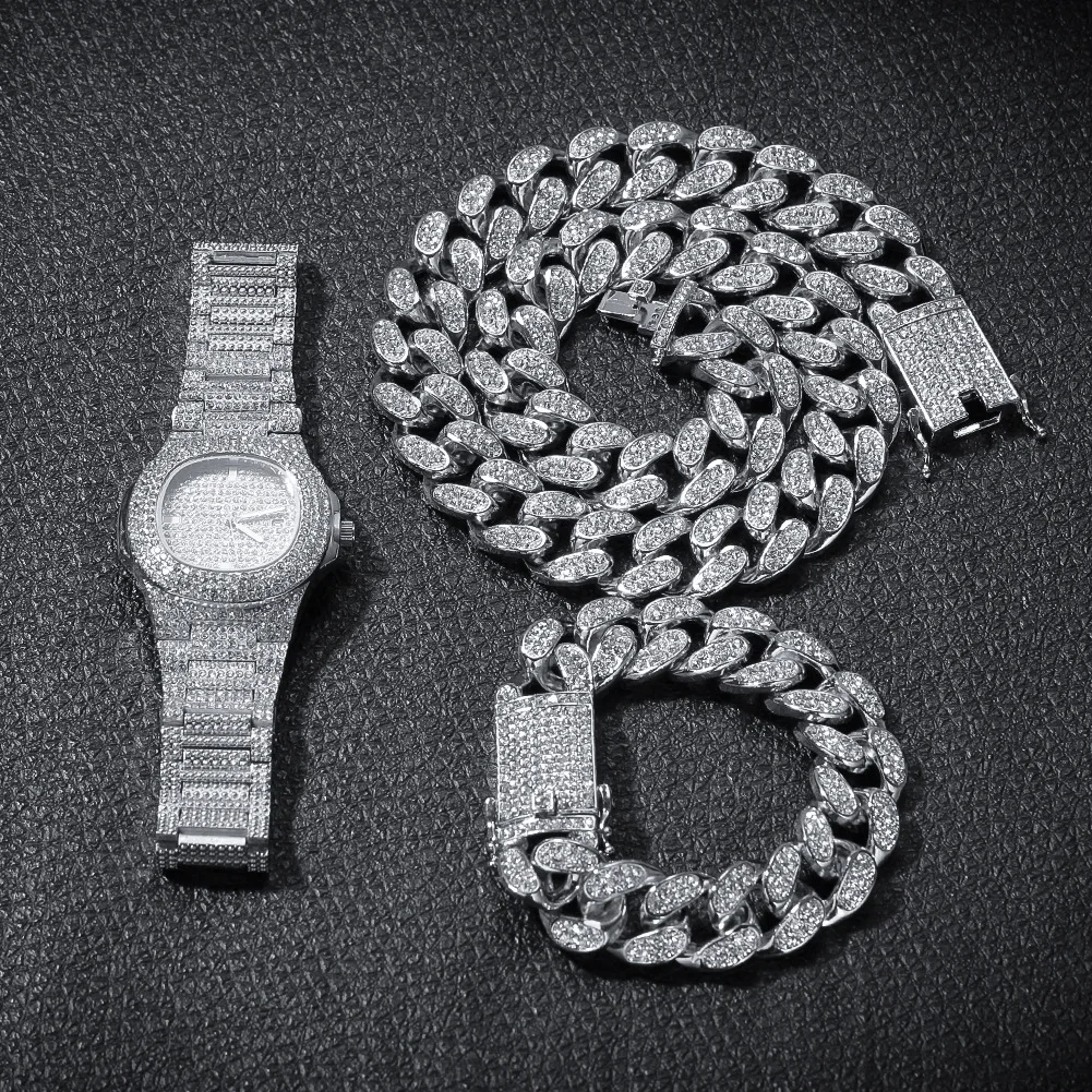 Кубинская цепь часы набор Цепочки и ожерелья Watch браслет в стиле хип-хоп Золото Льдом ограненные Стразы CZ Bling, реперские кепки для Для мужчин ювелирные изделия