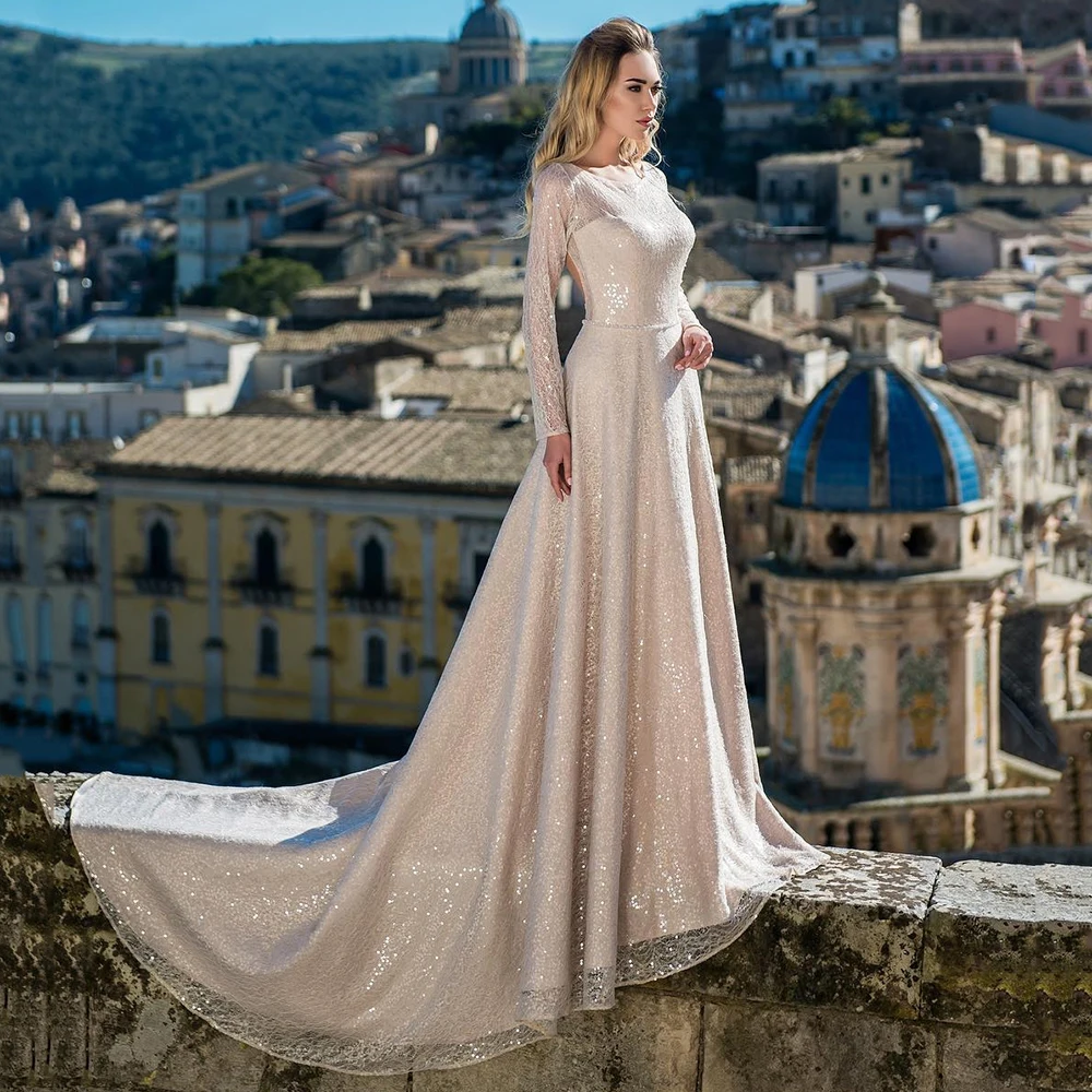 UZN Элегантное свадебное платье А-силуэта с глубоким круглым декольте, блестки в виде пайеток кружева Длинные свадебные платья рукавами и открытой спиной; Платья для невест платья