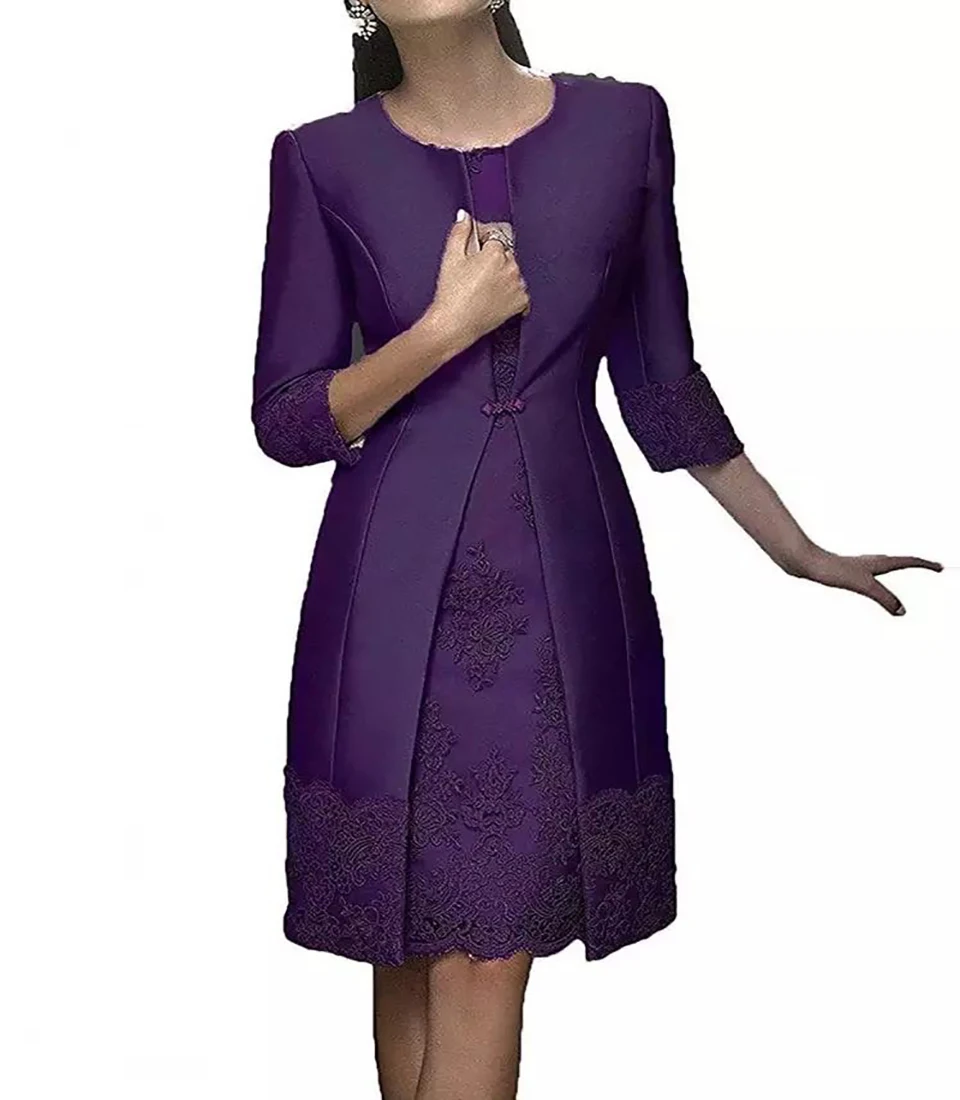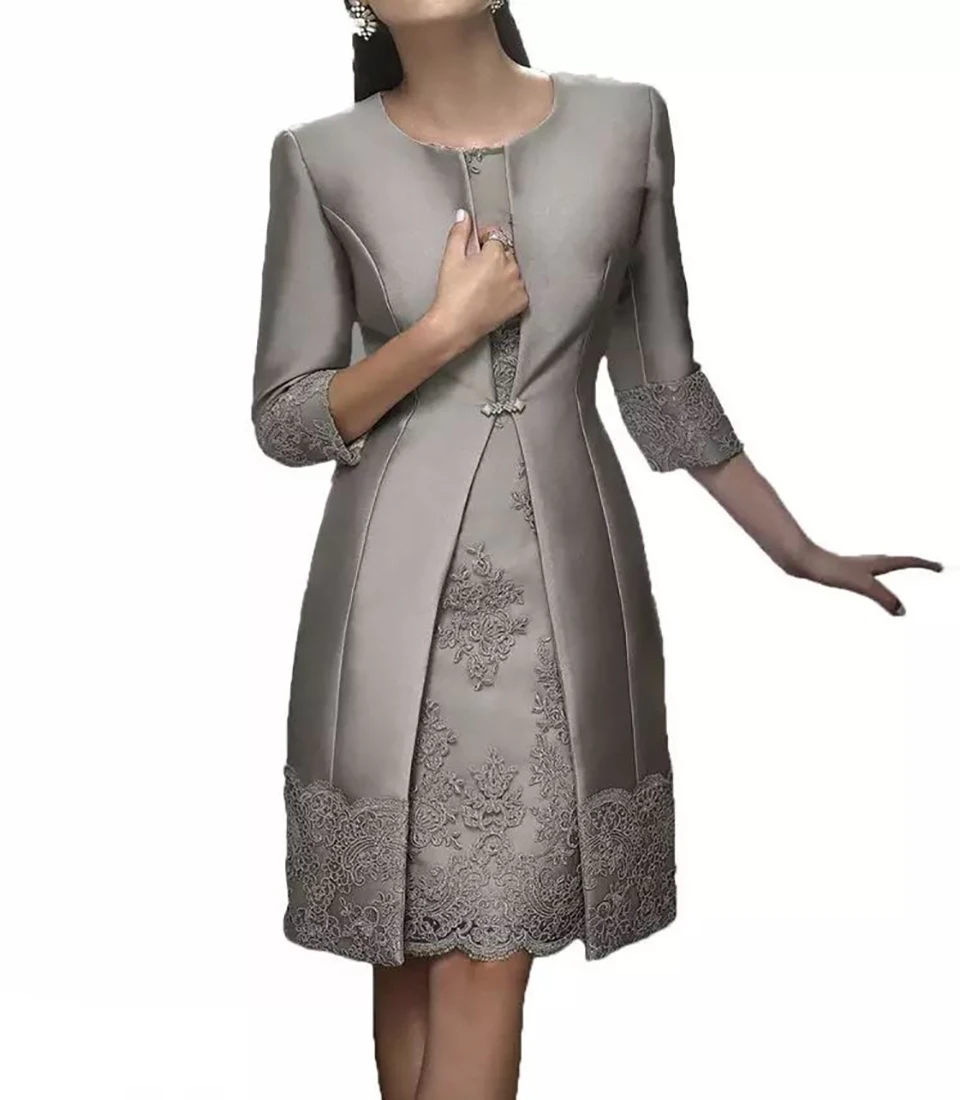 Платье-футляр для матери невесты, женское платье с круглым вырезом, длиной до колена, кружевное атласное платье 34, длинный рукав с аппликациями 2022
