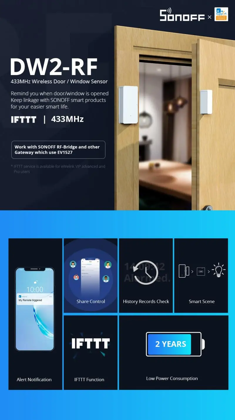 Датчик двери и окна SONOFF DW2, 433 МГц, с радиочастотным мостом, eWelink IFTTT