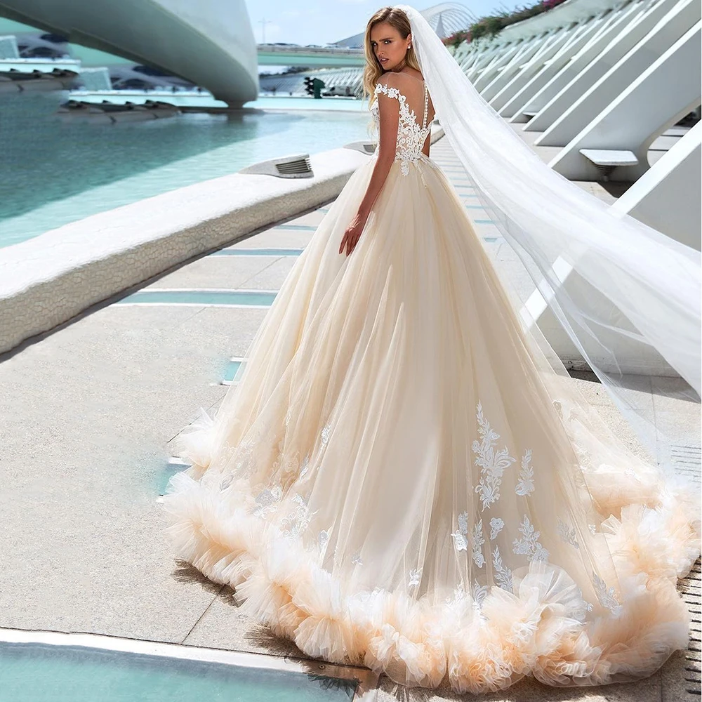 Женское свадебное платье-трапеция, из тюля, с рукавами-крылышками, кружевные аппликации для выреза